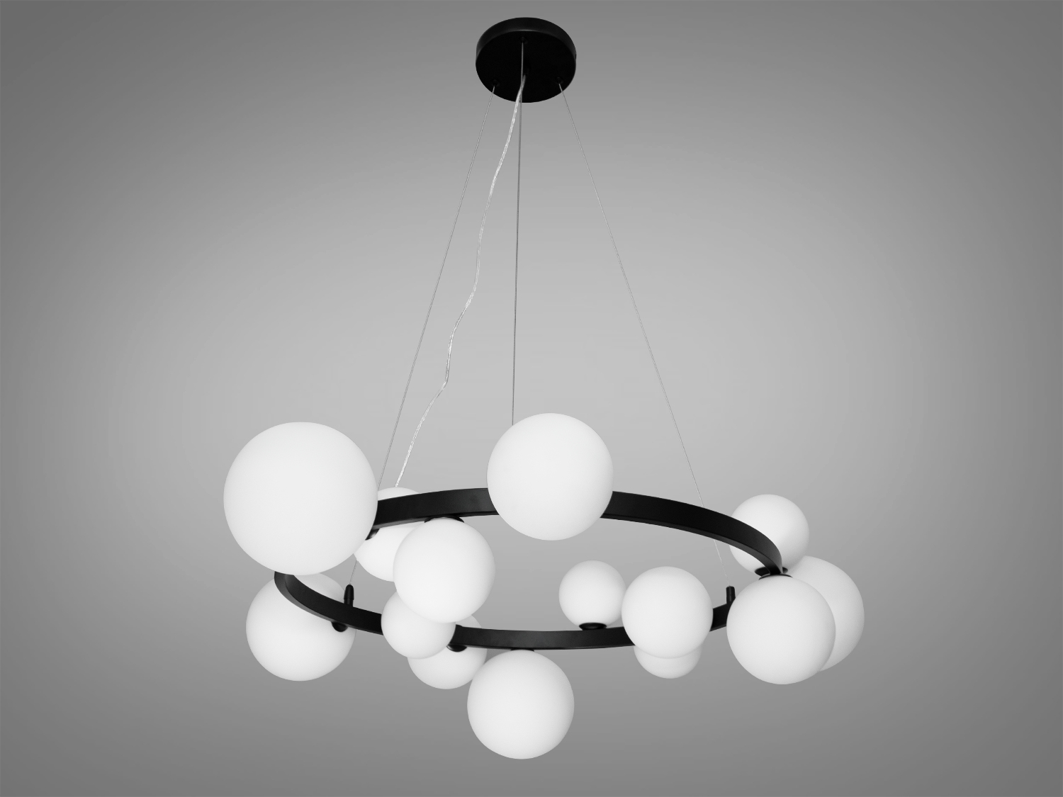 Металеве кільце, що висить на напівпрозорих підвісах, створює враження легкості та елегантності. Гальванічне покриття кільця надає люстру "Бульбашки" стильності та сучасному шарму. Кріплення підвісів на основі стель виконано з урахуванням високих стандартів безпеки та міцності. Кріпиться до стель будь-якого типу універсальним кріпленням-на планку.