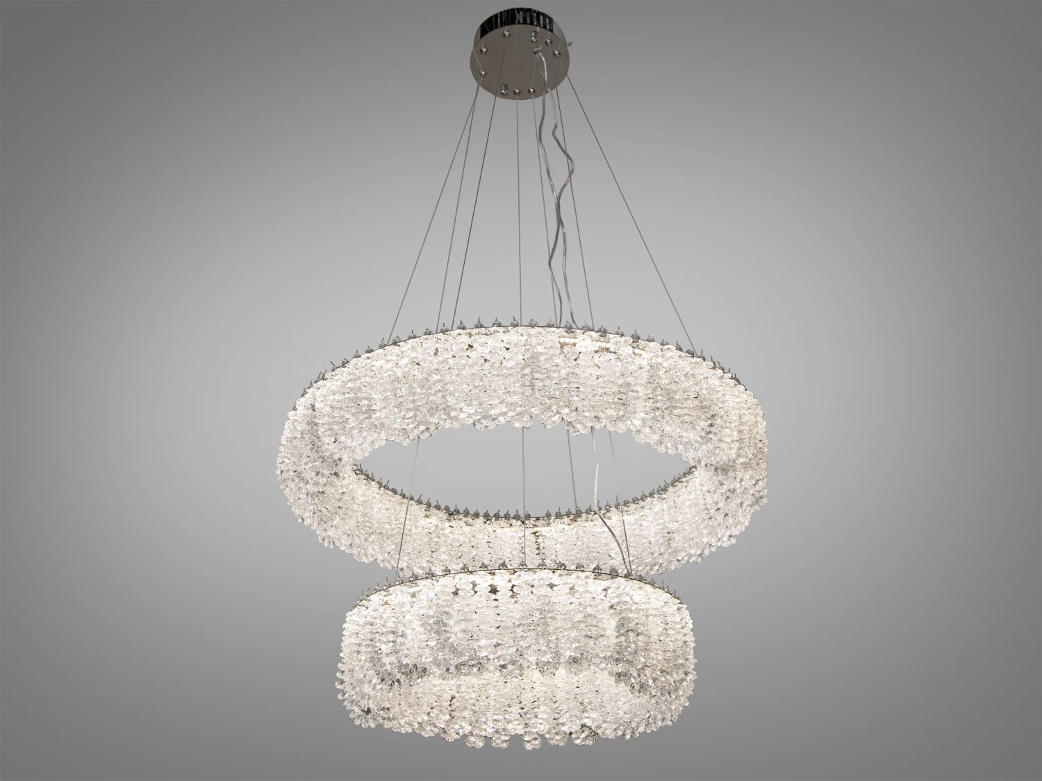 Люстра виготовлена з високоякісного хрому та прикрашена прозорими кришталевими підвісками, які створюють вражаючий світловий ефект. Її дві кільцеві конструкції розсіюють світло, наповнюючи простір теплотою і затишком.