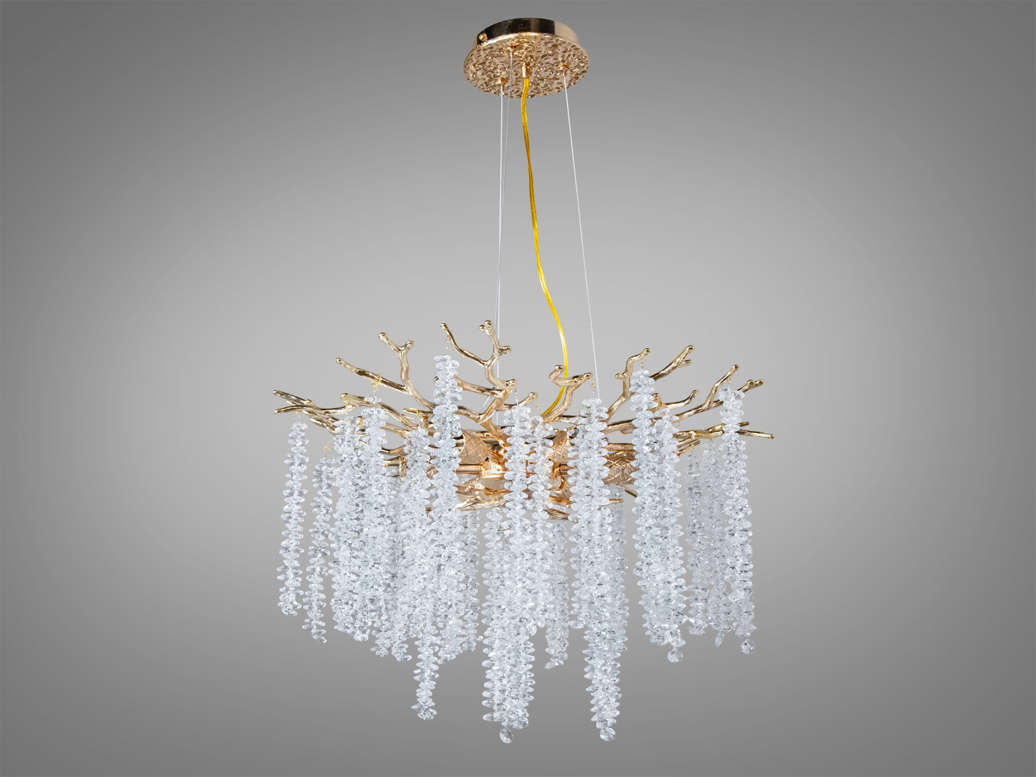 Центральний каркас люстри має форму гілок, що гілкуються, які ніби зіткані з металу і створюють відчуття природної краси. Кожна гілочка прикрашена кришталевими підвісками, що імітують витончені грона гліцинії, що сяють під будь-яким кутом огляду, створюючи ефект мерехтливого сяйва.