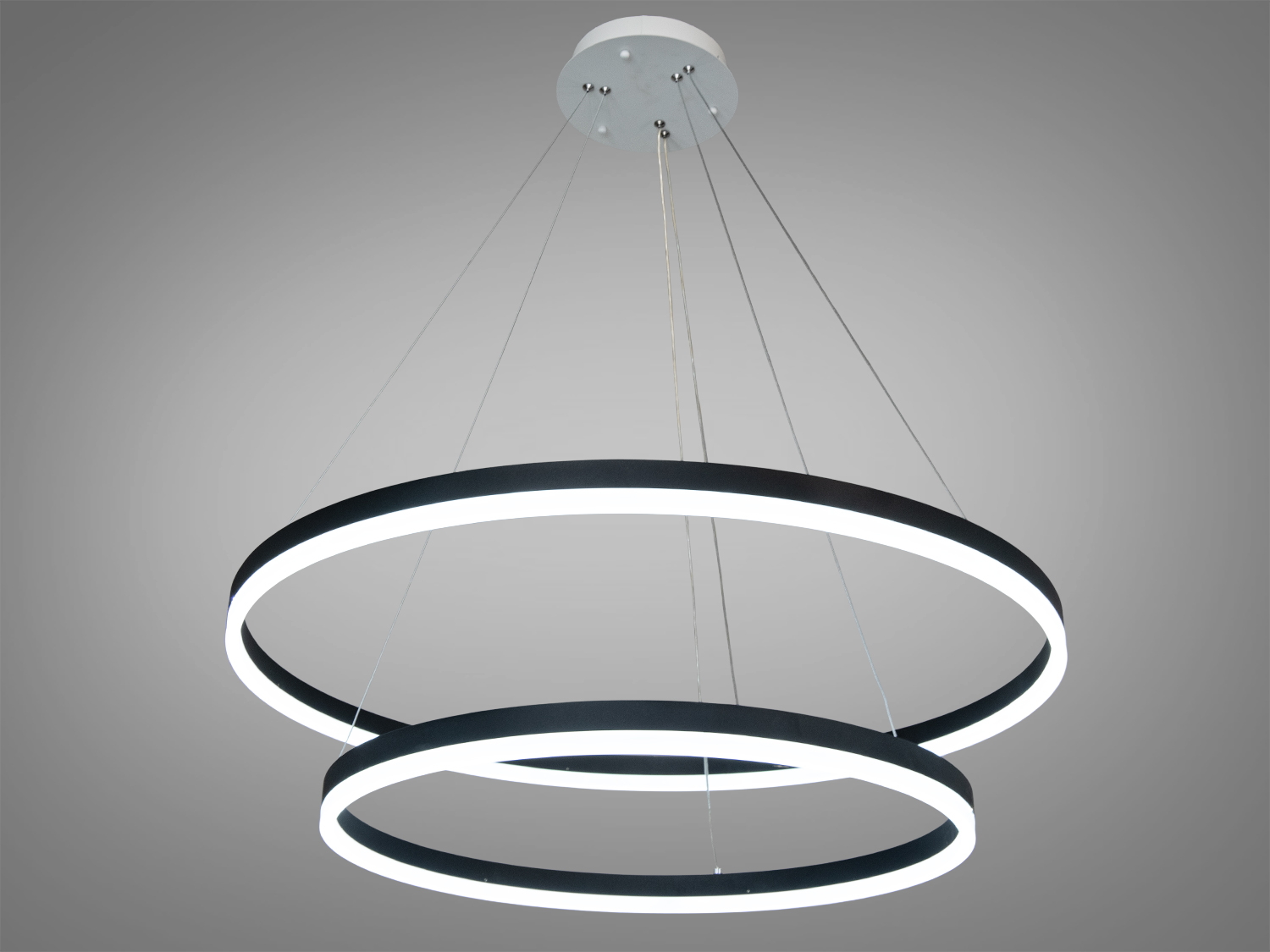 Основний елемент люстри - ідеально рівне металеве кільце з матовим чорним покриттям, яке підкреслює геометрію та елегантність форми. Світлодіодний розсіювач вбудований за внутрішнім периметром, створюючи рівномірне та м'яке свічення без відблисків. Тонкі підвіси роблять конструкцію майже невидимою, посилюючи ефект ширяння люстри у просторі.