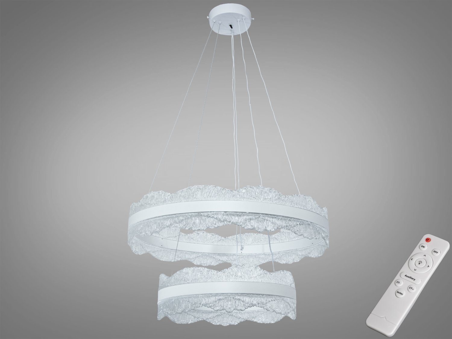 Світильник має підвісну конструкцію з можливістю регулювання висоти та кута розташування кілець, що дозволяє створювати як концентричні, так і асиметричні композиції. Пульт дистанційного керування забезпечує зручне регулювання яскравості світла без необхідності підходити до вимикача, що особливо зручно для вечірнього відпочинку або роботи.