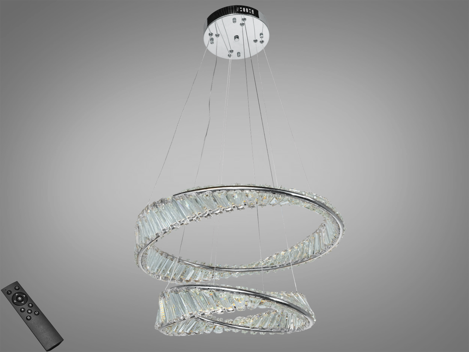 Кришталеві вставки з ефектом переломлення світла надають люстрі об′єму та виразності, а хромована основа гармонійно поєднується з металевими, скляними й сучасними інтер′єрними матеріалами. Дві кільця світильника створюють м′яке, рівномірне освітлення, яке легко адаптується під різні сценарії.