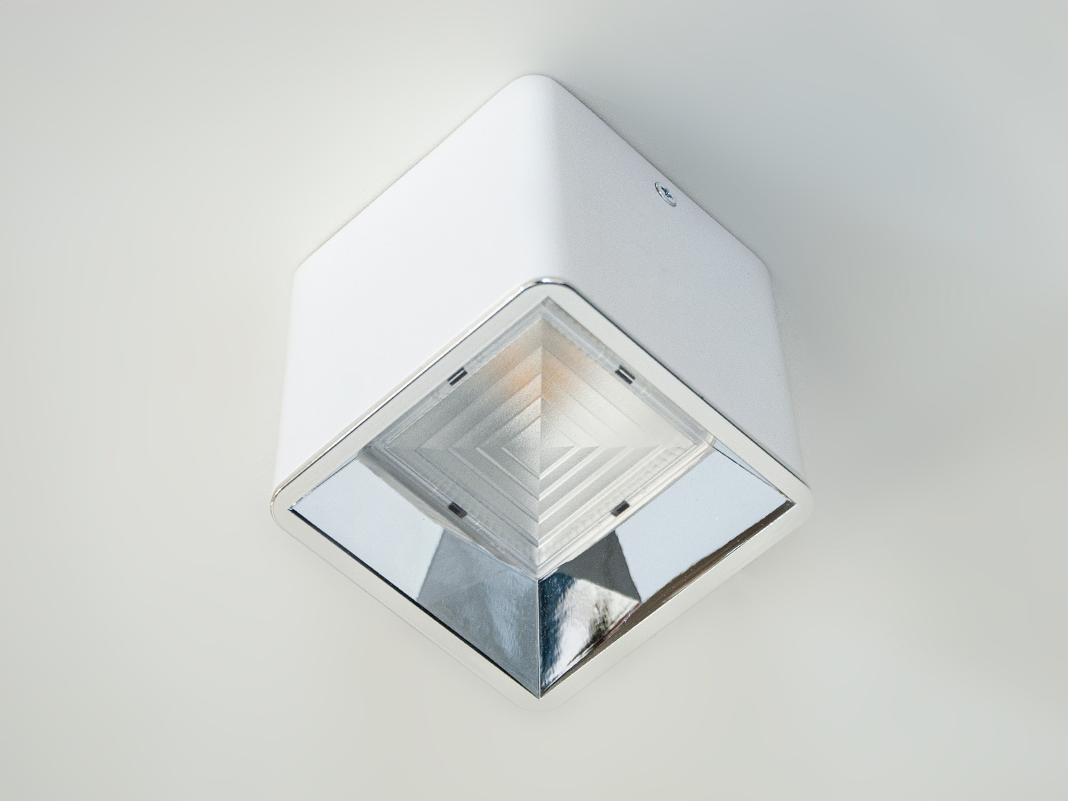 Універсальність дизайну: Кубічна форма з заокругленими краями і біле забарвлення ззовні з матовим хромом всередині робить світильник дуже універсальним. Він може ідеально вписуватися в сучасні інтер'єри з мінімалістичним або навіть футуристичним дизайном, а також гармонійно виглядати в приміщеннях, оформлених у стилі хай-тек, скандинавському або лофт.