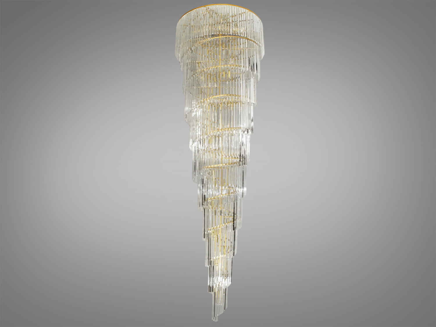 Довга стильна кришталева люстра для високої стелі ідеально підходить для використання в холах або вітальнях, сходових зонах приватних будинків, ресторанів або готелях. Кришталеві підвіски, виконані у правильній формі, створюють захоплюючий світловий ефект, граючи на світлі.
