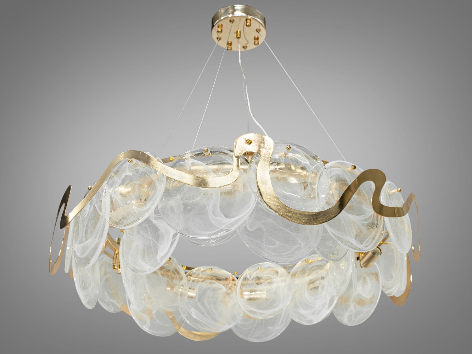 Люстра підвіс із круглими скляними елементами на 8 ламп, з металевим корпусом добре виглядатиме в сучасному інтер'єрі зали, спальні, коридору або кухні. На неї можна дивитися під будь-яким кутом, і не дивлячись на легкість конструкції люстри, ви завжди бачитимете лампи тільки через матове скло. Висота люстри регулюється, завдяки чому підходить для низьких стель. Люстра-підвіс під звичайні лампочки розжарювання, економки або світлодіодні лампи з цоколем Е14. Стельове кріплення на планку універсальне підходить для навісних, натяжних та звичайних стель.