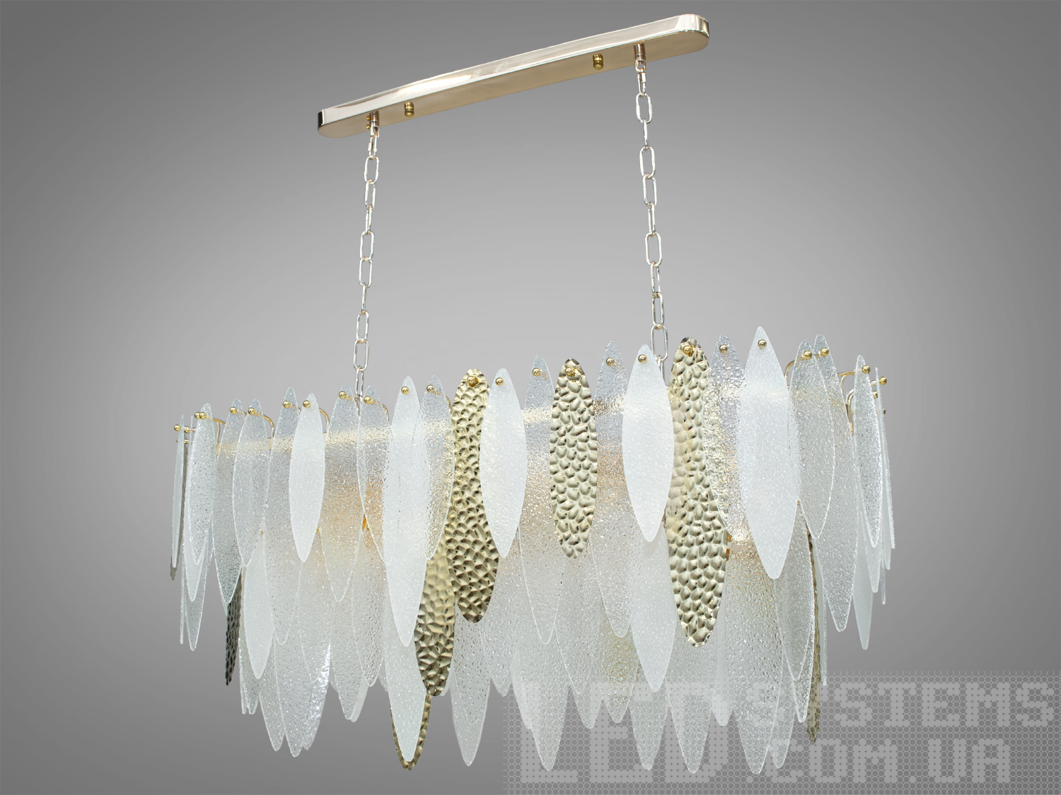 У той же час все світло випромінюване лампами перевідбившись від поверхні скляних пелюсток поступово пошириться по приміщенню. Пропорції овальних люстр ідеально гармонують із великими обідніми столами.