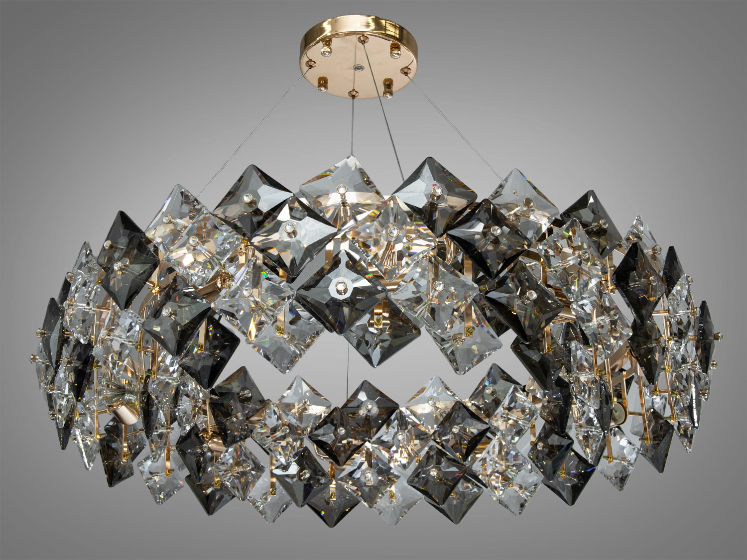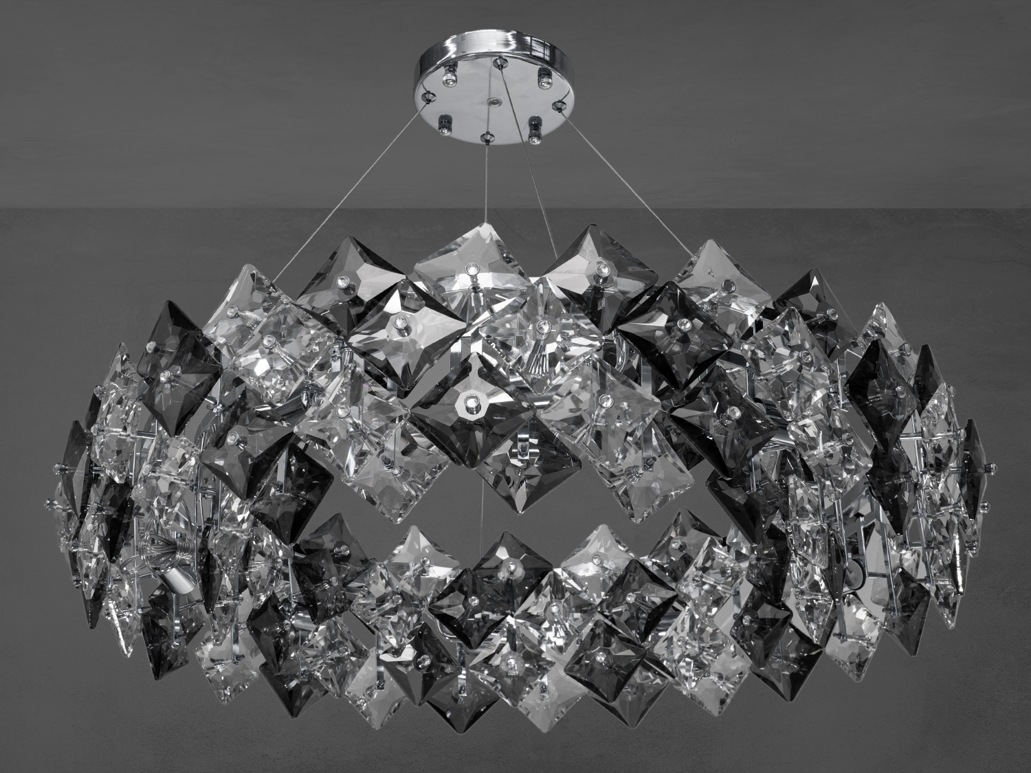 Периметр світильника виконаний з акрилової смоли, яка не поступається за декоративними властивостями кришталю. На стелі з′являються красиві промені світла, що додають вишуканості та затишку. Цей дизайн робить приміщення візуально просторішим та світлішим, надаючи йому неповторної атмосфери.