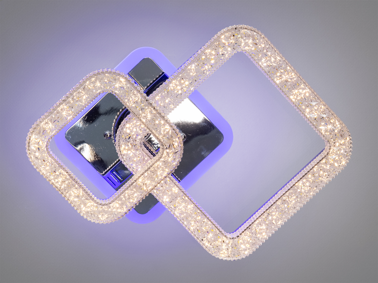 Вишукана LED люстра в спальню з пультом, з димером, з кольоровим підсвічуванням стане центральним елементом вашого інтер'єру, гармонійно поєднуючи сучасний дизайн та передові технології. Її унікальна форма з квадратами, що перетинаються, прикрашеними декоративною текстурою, створює ефектний візуальний акцент. Люстра оснащена світлодіодним підсвічуванням, що регулюється яскравістю за допомогою пульта та димера, що дозволяє легко налаштувати освітлення під будь-який настрій та потреби.