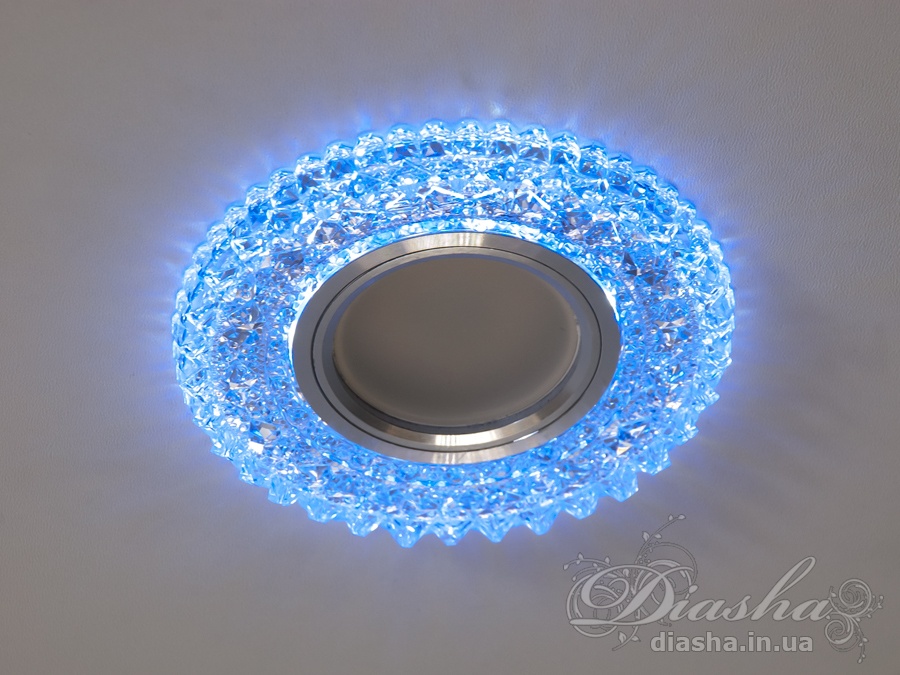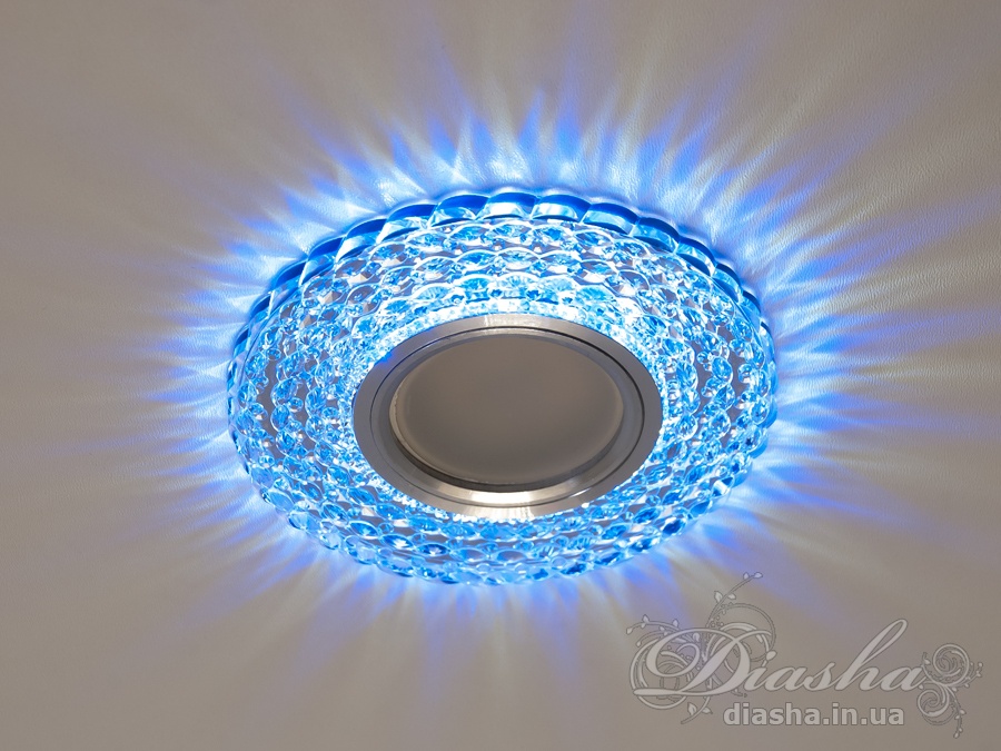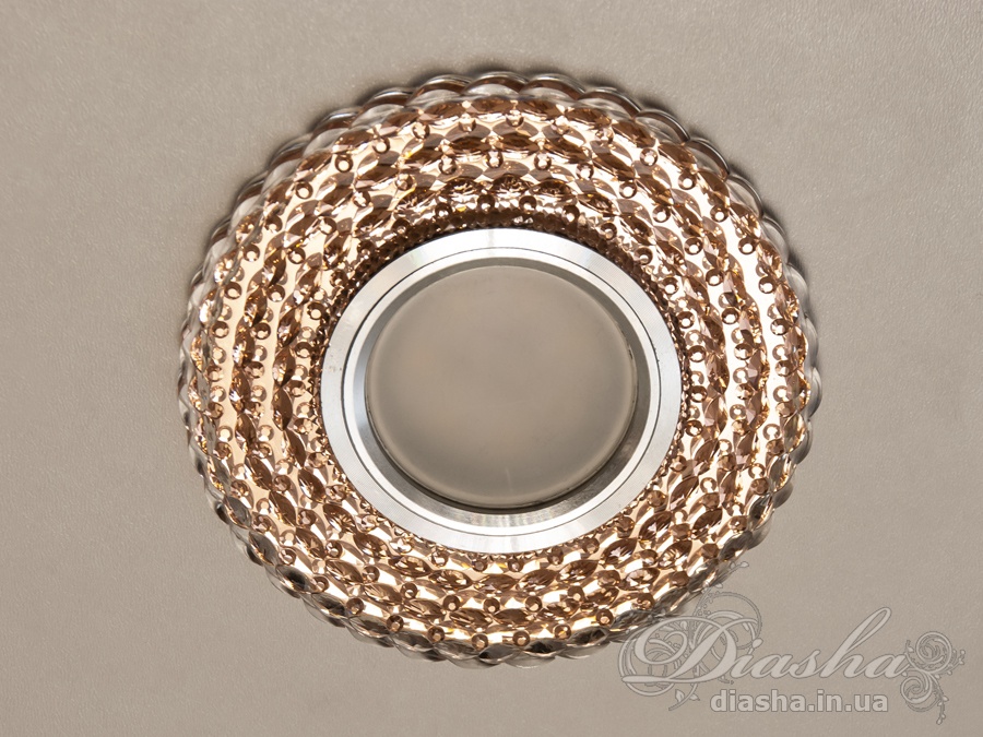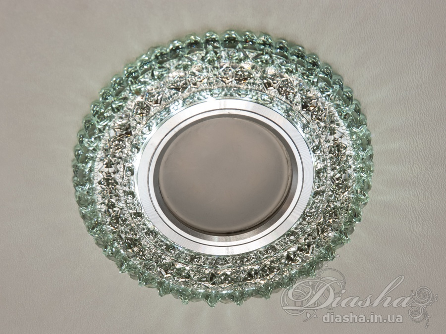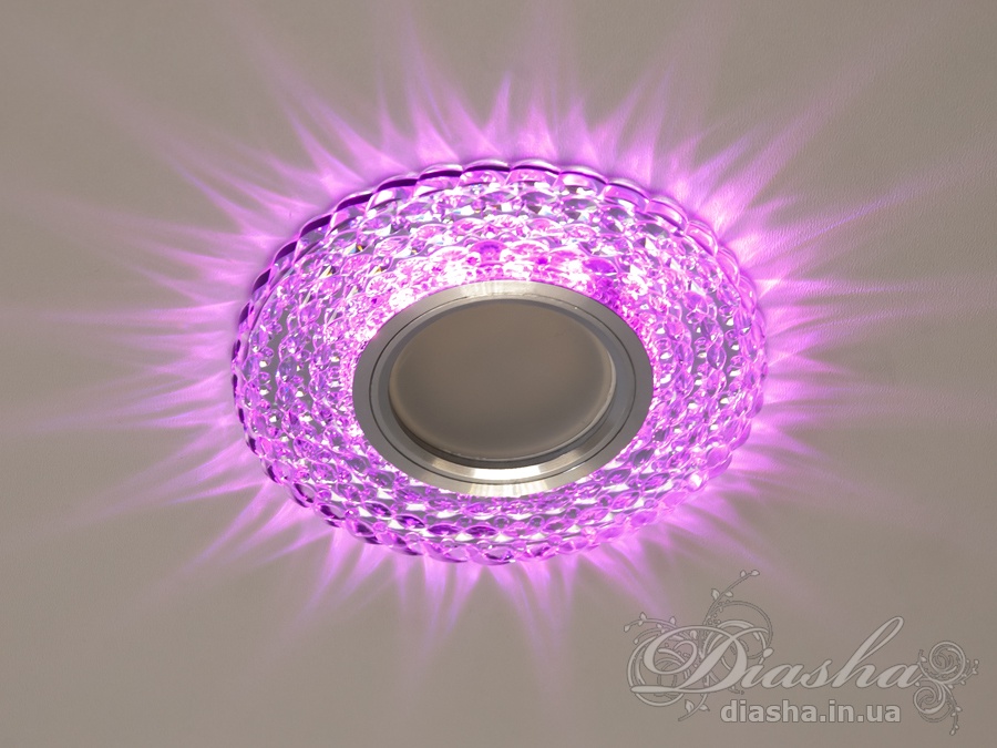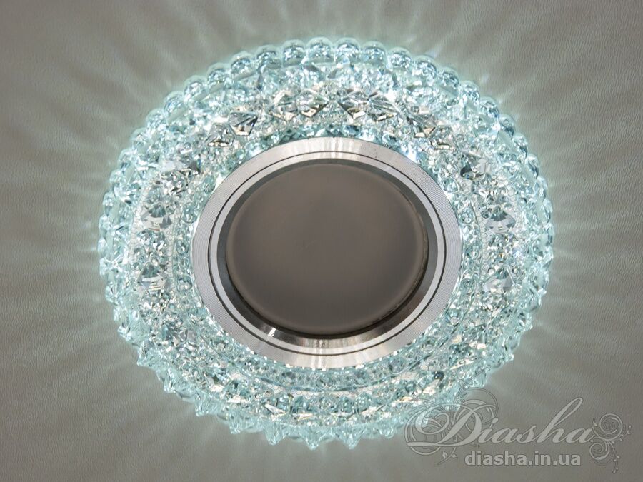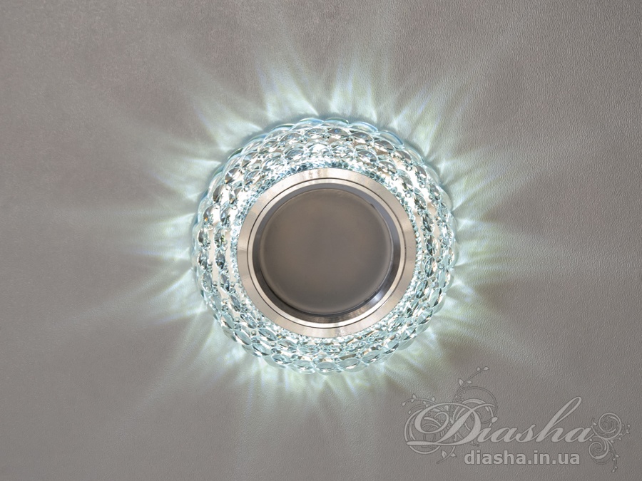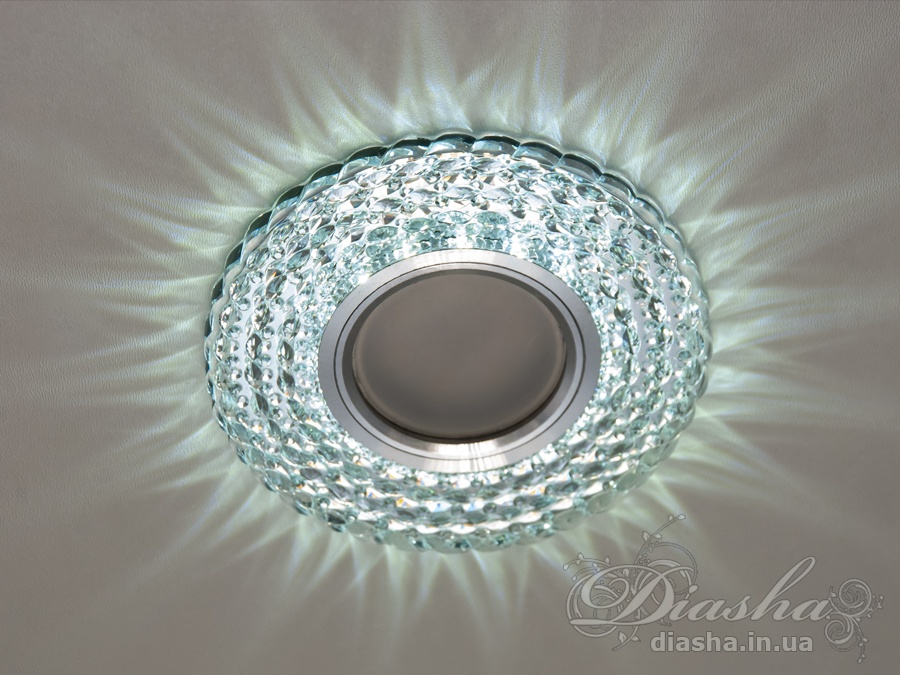 Корпус світильника виготовлений з високоякісної оптичної акрилової смоли, яка надає йому вигляд кришталю. Це не тільки забезпечує чудове розсіювання світла, але й додає декоративний ефект. Периметр точкового врізного світильника обрамлений вбудованим LED підсвічуванням потужністю 3 Вт, що створює м′який світловий ореол навколо світильника. Такий ефект додає вишуканості та затишку приміщенню, створюючи неповторну атмосферу. Встановлення точкових світильників по периметру стелі візуально підвищує її та робить простір кімнати більшим і відкритим.