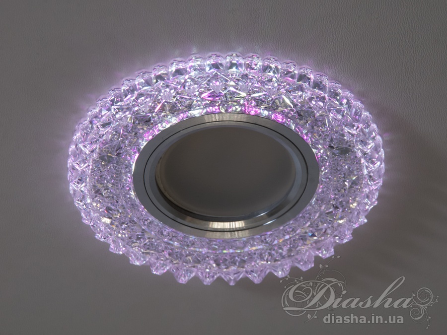Корпус світильника виготовлений з оптичної акрилової смоли, що нагадує кришталь. Це забезпечує чудове розсіювання світла, створюючи м′яку атмосферу в приміщенні. Декоративні елементи світильника іскряться, як бенгальські вогні, перетворюючи звичайне освітлення у мистецтво. Периметр точкового врізного світильника обрамлений вбудованим LED підсвічуванням потужністю 3 Вт, що створює м′який світловий ореол навколо світильника. Такий ефект додає вишуканості та затишку приміщенню, створюючи неповторну атмосферу. Встановлення точкових світильників по периметру стелі візуально підвищує її та робить простір кімнати більшим і відкритим.