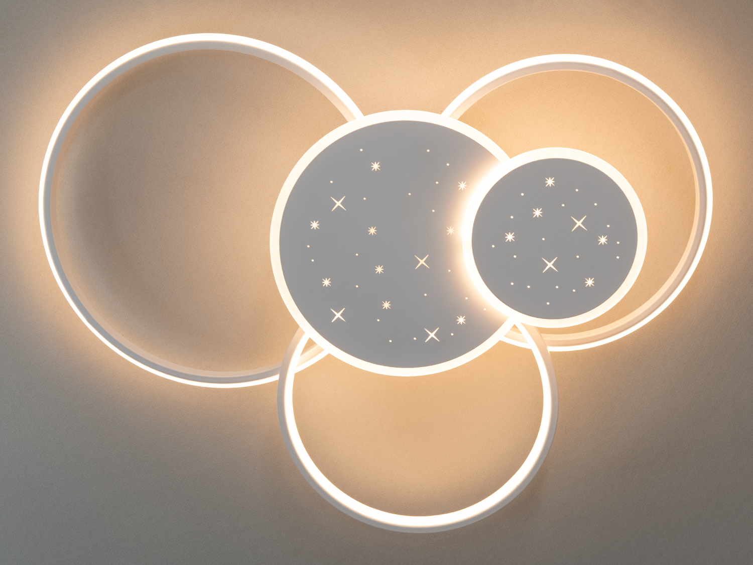 Стельова LED люстра для зали – це втілення сучасного дизайну та технологічної досконалості. Її унікальна геометрична форма, що складається з трьох кілець, що перетинаються світяться, створює відчуття динаміки, легкості і балансу. Центральна панель, прикрашена мініатюрними світловими точками, нагадує зоряне небо, додаючи елемент загадковості та елегантності.