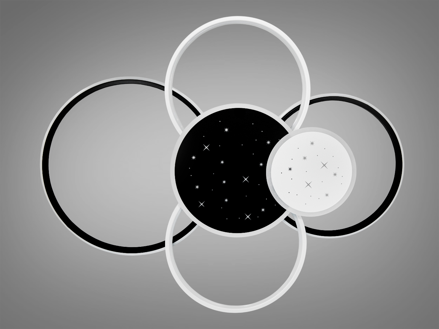 Універсальна світлодіодна люстра в пультом – це вишуканий елемент освітлення, що поєднує сучасну геометрію та елегантну легкість форм. Композиція з переплетених кілець, що світяться, створює відчуття руху і легкості, немов орбіти планет, з'єднані в досконалій гармонії. Центральні панелі прикрашені мініатюрними світловими точками, що нагадують зоряне небо, що надає люстрі ефекту загадковості та витонченої розкоші.