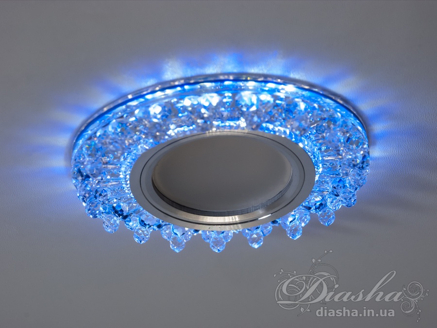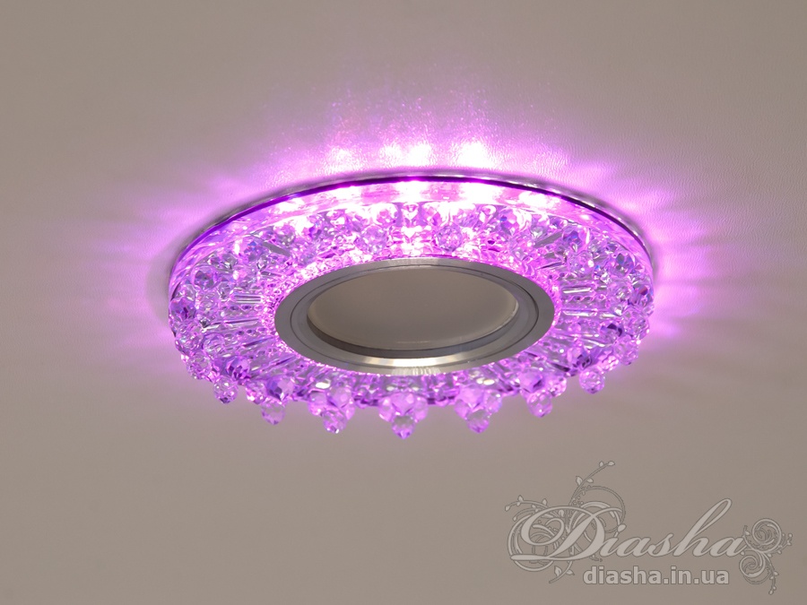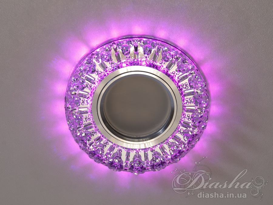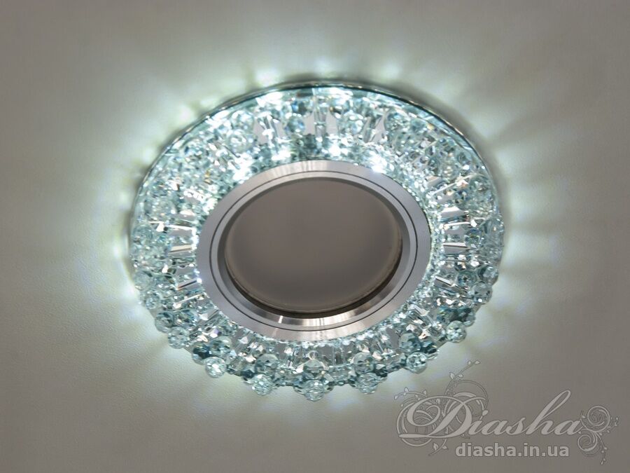 Периметр точкового врізного світильника обрамлений вбудованим LED підсвічуванням потужністю 3 Вт, що створює м′який світловий ореол навколо світильника. Такий ефект додає вишуканості та затишку приміщенню, створюючи неповторну атмосферу. Встановлення точкових світильників по периметру стелі візуально підвищує її та робить простір кімнати більшим і відкритим.