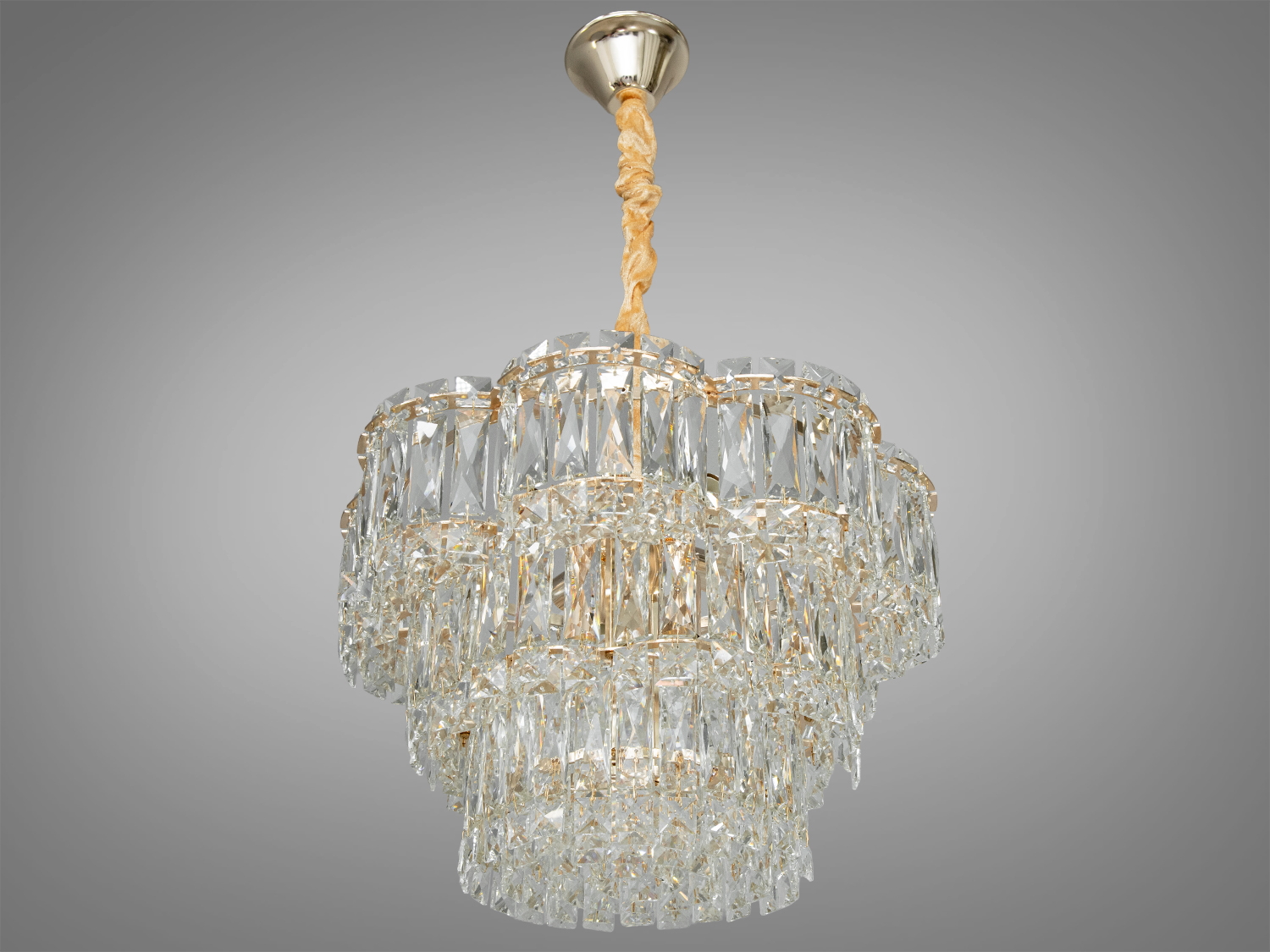 Люстра складається з кількох ярусів підвісок з кришталю, які чудово відбивають світло, створюючи гру світла та тіней на стінах та стелі. Дизайн доповнений оксамитовим чохлом, що надає моделі особливого шику та витонченості. Люстра підвішується на елегантному ланцюзі, висоту люстри можна регулювати від 40 до 78см, що дозволяє адаптувати освітлення під будь-які потреби та розміри приміщення.