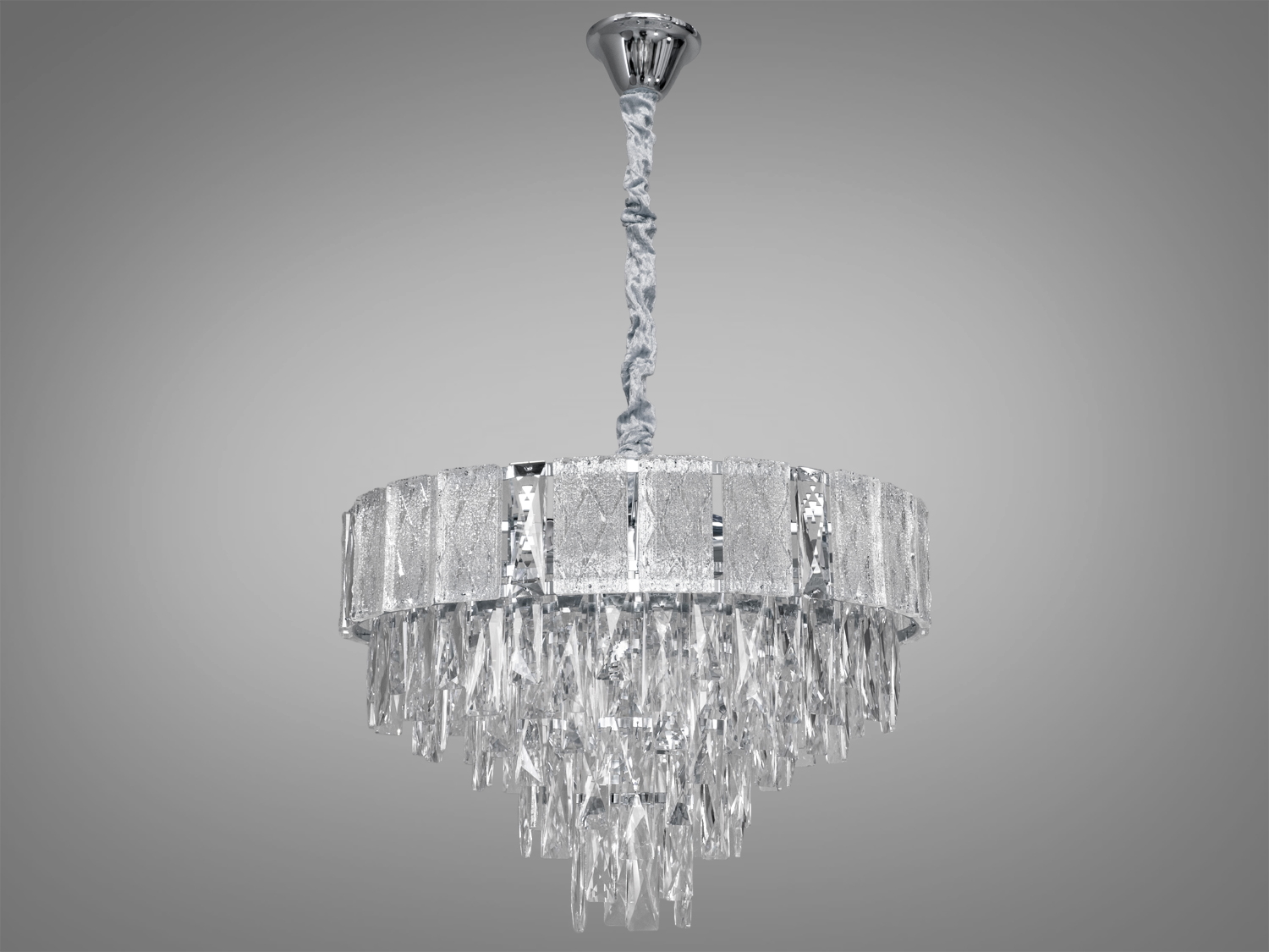 Люстра складається з декількох ярусів підвісок з кришталю та скла, які чудово відбивають світло, створюючи гру світла та тіней на стінах та стелі. Дизайн доповнений оксамитовим чохлом, що надає моделі особливого шику та витонченості. Люстра підвішується на елегантних ланцюгах, висоту люстри можна регулювати від 45 до 80см, що дозволяє адаптувати освітлення під будь-які потреби та розміри приміщення.