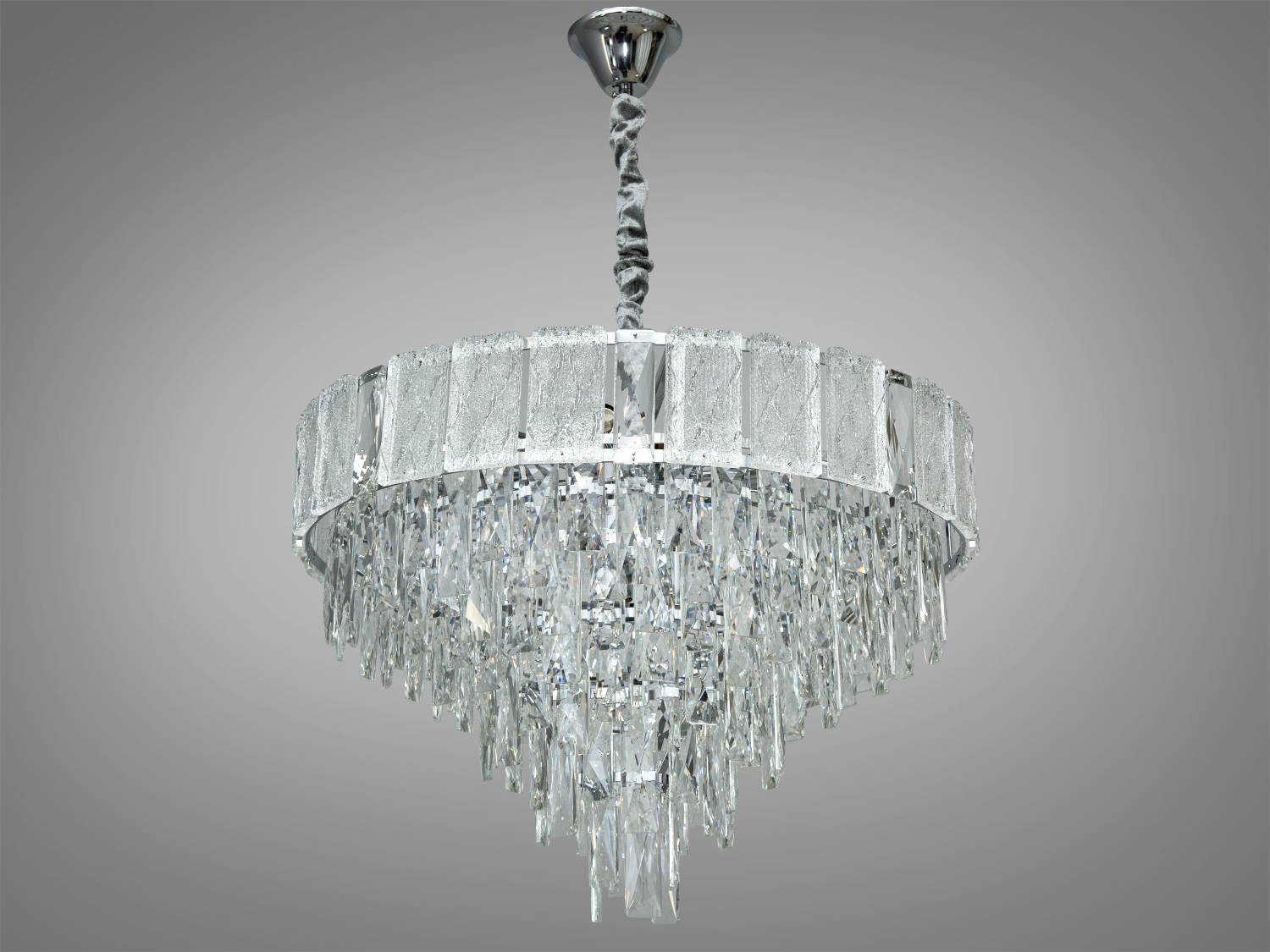 Розкішна кришталева люстра для зали - це блискуче втілення урочистої елегантності, яка створює в інтер'єрі відчуття величі та світла. Її форма заснована на класичній циліндричній конструкції, де масивний металевий обід обрамлений блискучими кришталевими підвісками, що спадають багатоярусним каскадом. Кожен елемент - від ідеально огранених скляних крапель до сяючих пластин верхнього ярусу - відбиває світло, немов дорогоцінний камінь, розсипаючи тисячі відблисків по кімнаті.