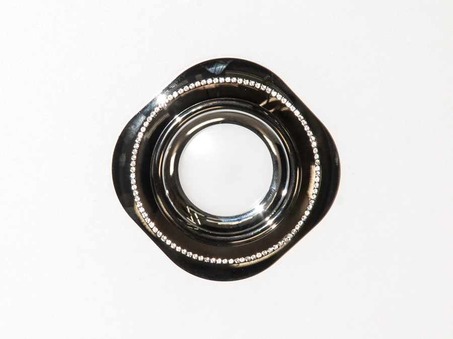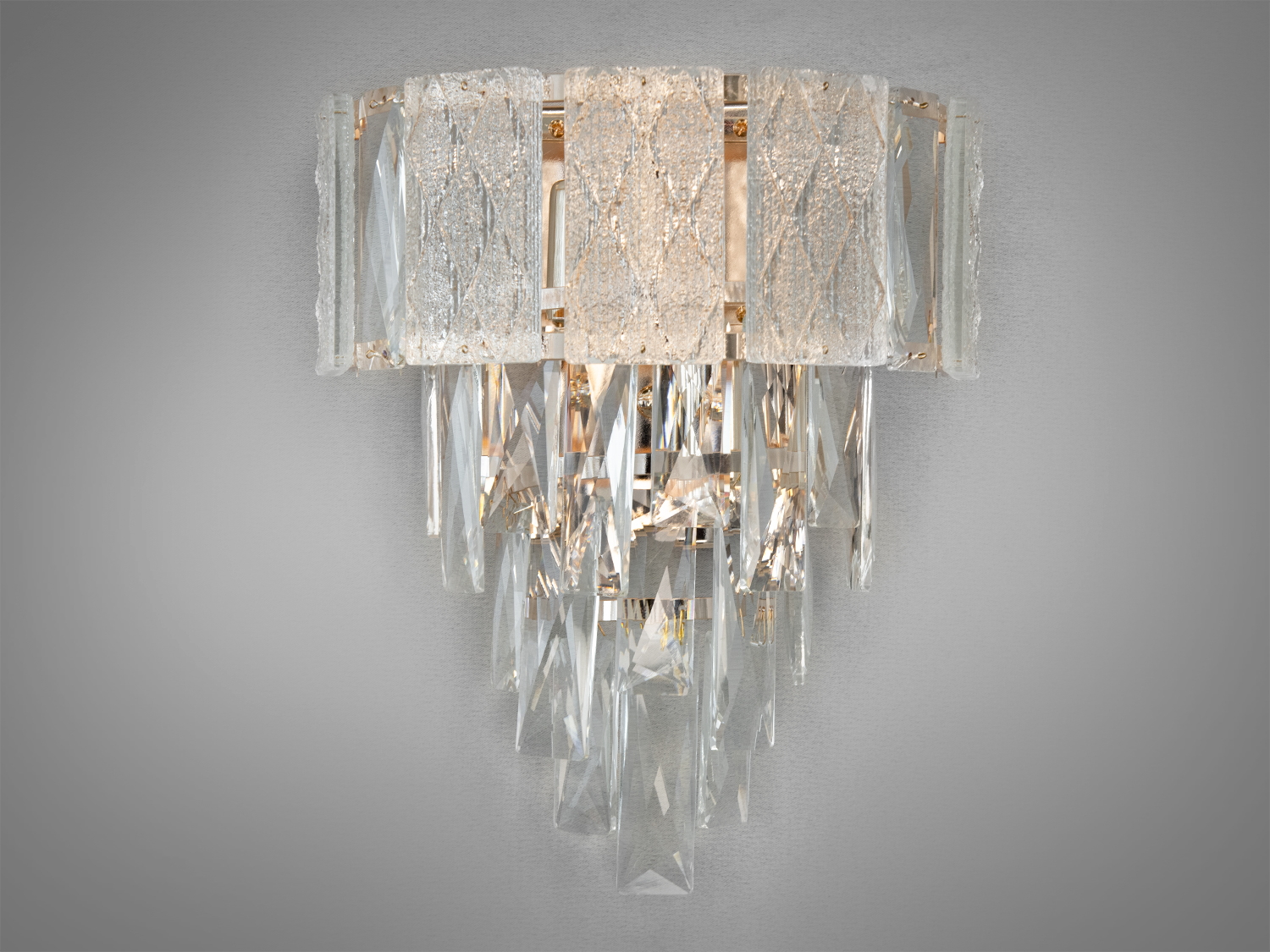 Люстра складається з декількох ярусів підвісок з кришталю та скла, які чудово відбивають світло, створюючи гру світла та тіней на стінах та стелі. Дизайн доповнений оксамитовим чохлом, що надає моделі особливого шику та витонченості. Люстра підвішується на елегантних ланцюгах, висоту люстри можна регулювати від 60 до 100см, що дозволяє адаптувати освітлення під будь-які потреби та розміри приміщення.