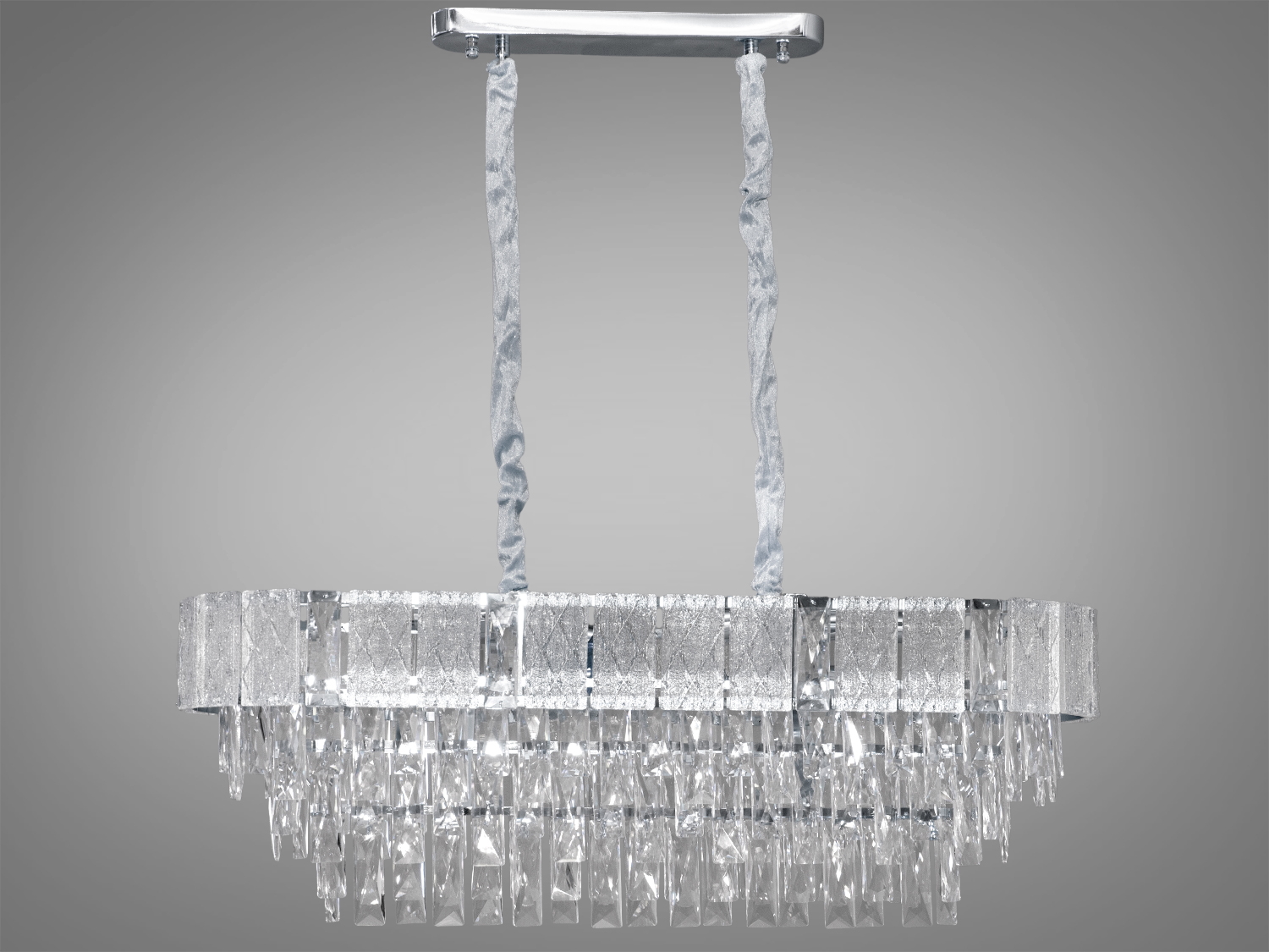 Люстра складається з декількох ярусів підвісок з кришталю та скла, які чудово відбивають світло, створюючи гру світла та тіней на стінах та стелі. Дизайн доповнений оксамитовим чохлом, що надає моделі особливого шику та витонченості. Люстра підвішується на елегантних ланцюгах, висоту люстри можна регулювати від 40 до 85см, що дозволяє адаптувати освітлення під будь-які потреби та розміри приміщення.