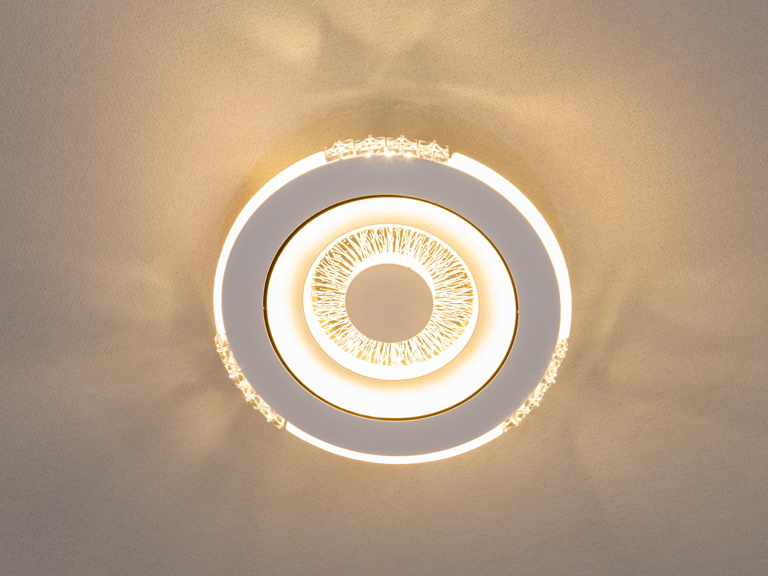 Світлодіодний світильник у спальню поєднує в собі елегантність класики та сучасні технології. Його кругла форма з витонченими деталями та декоративними вставками надає простору витонченого вигляду, а світловий малюнок створює відчуття глибини та легкості. Дизайн світильника нагадує кришталеву оправу, підкреслюючи стиль та вишуканість інтер'єру.