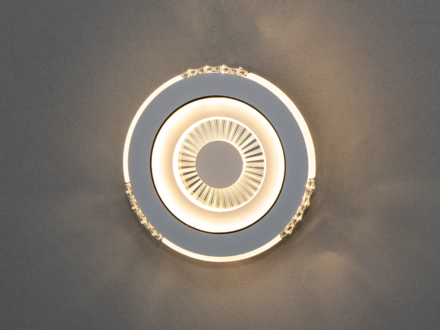 Круглий LED світильник у вітальню поєднує в собі елегантність класики та сучасні технології. Його кругла форма з витонченими деталями та декоративними вставками надає простору витонченого вигляду, а світловий малюнок створює відчуття глибини та легкості. Дизайн світильника нагадує кришталеву оправу, підкреслюючи стиль та вишуканість інтер'єру.
