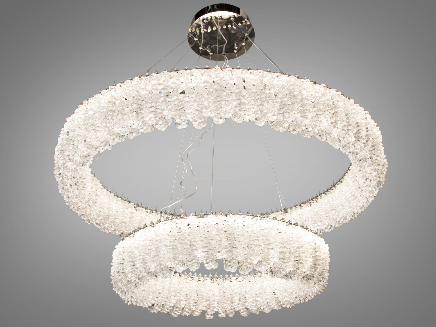 Люстра виготовлена з високоякісного хрому та прозорого кришталю, що створює вражаючий блиск і підкреслює сучасний стиль. Дві кільцеві конструкції прикрашені кришталевими підвісками, що відбивають світло на всі сторони.