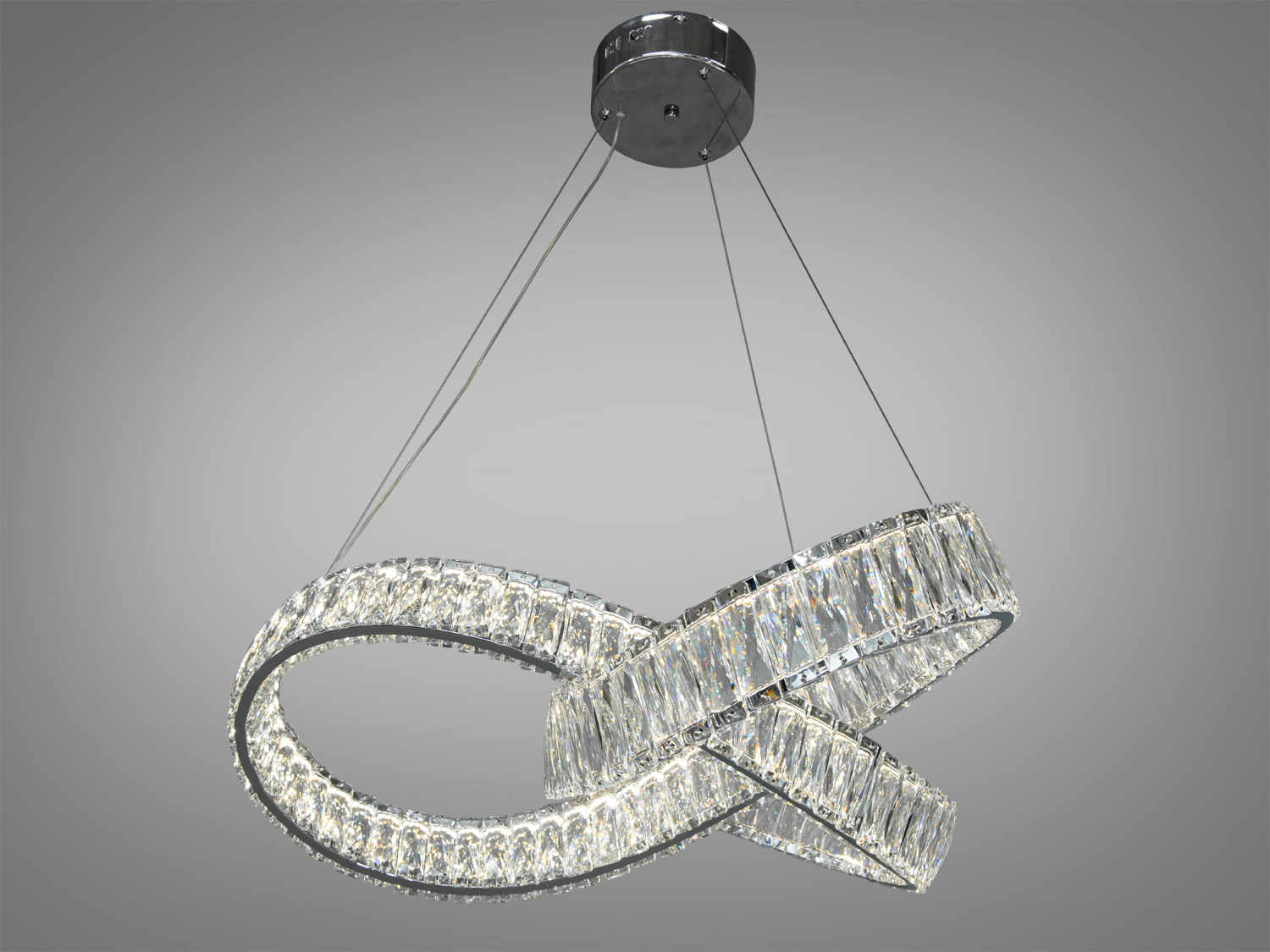 Унікальна світлодіодна кришталева люстра на підвісах привертає увагу своєю оригінальною формою, що нагадує стрічку Мебіуса, символ нескінченності та вічності. Оснащена сучасними світлодіодами, люстра обіцяє довговічність та енергоефективність, зменшуючи витрати на електроенергію та потребу у частій заміні джерел світла.