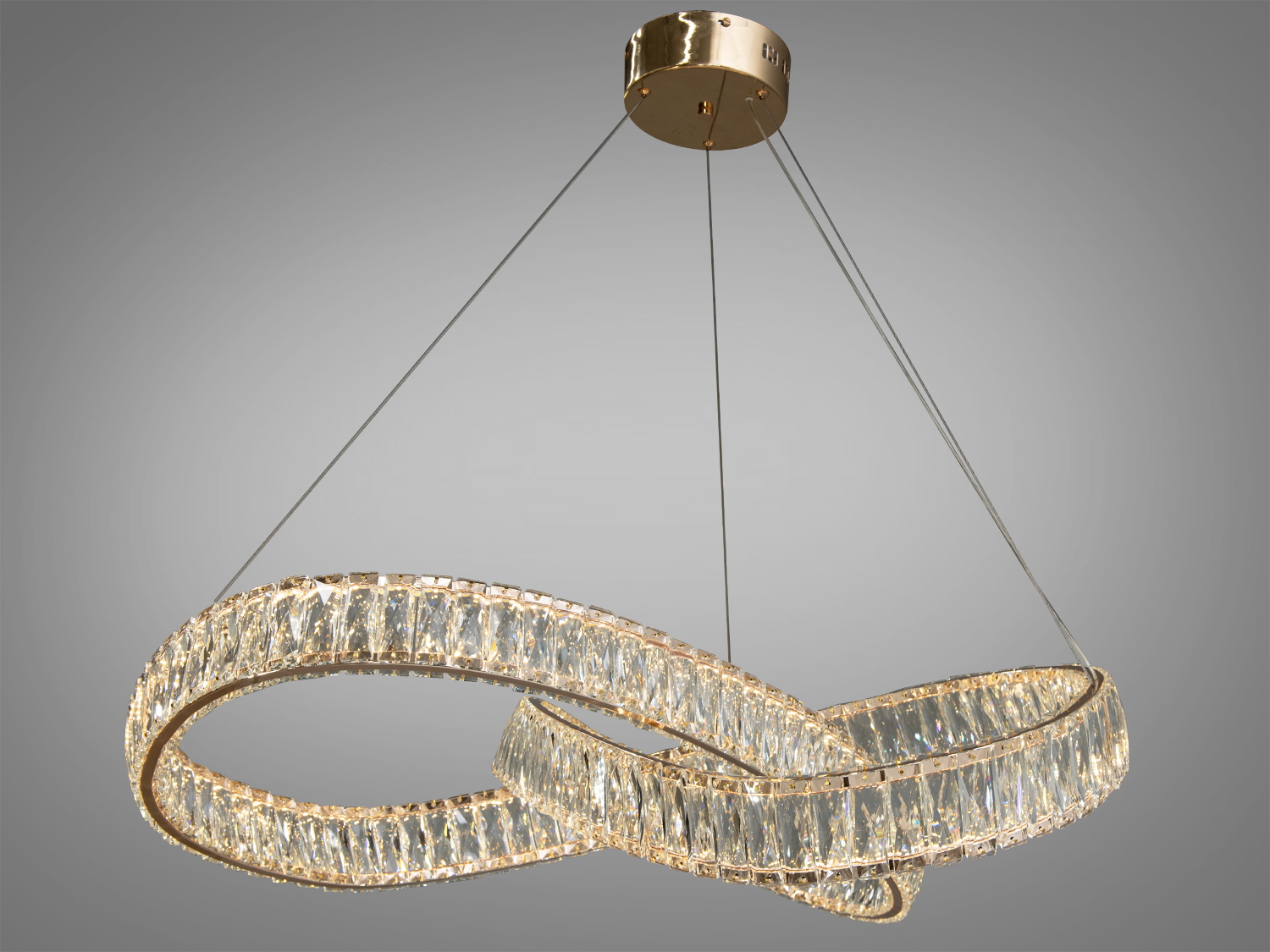 Унікальна світлодіодна кришталева люстра на підвісах привертає увагу своєю оригінальною формою, що нагадує стрічку Мебіуса, символ нескінченності та вічності. Оснащена сучасними світлодіодами, люстра обіцяє довговічність та енергоефективність, зменшуючи витрати на електроенергію та потребу у частій заміні джерел світла.