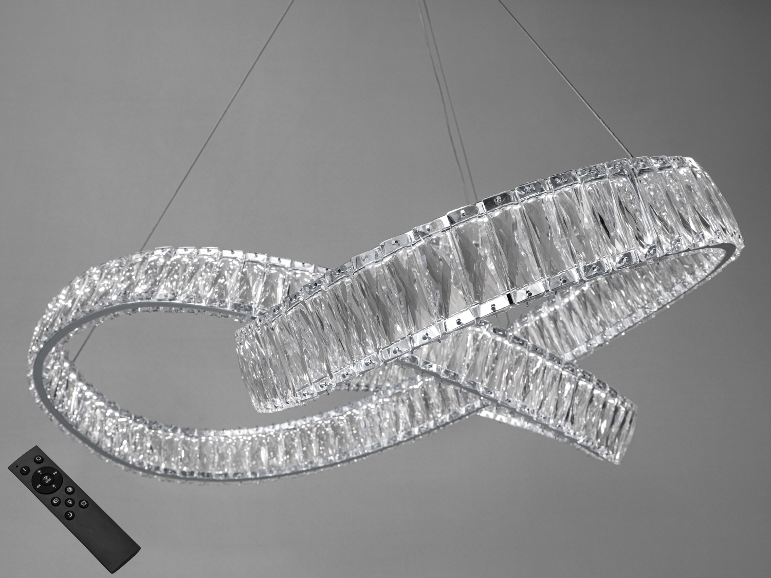 Унікальна світлодіодна кришталева люстра на підвісах привертає увагу своєю оригінальною формою, що нагадує стрічку Мебіуса, символ нескінченності та вічності. Оснащена сучасними світлодіодами, люстра обіцяє довговічність та енергоефективність, зменшуючи витрати на електроенергію та потребу у частій заміні джерел світла.