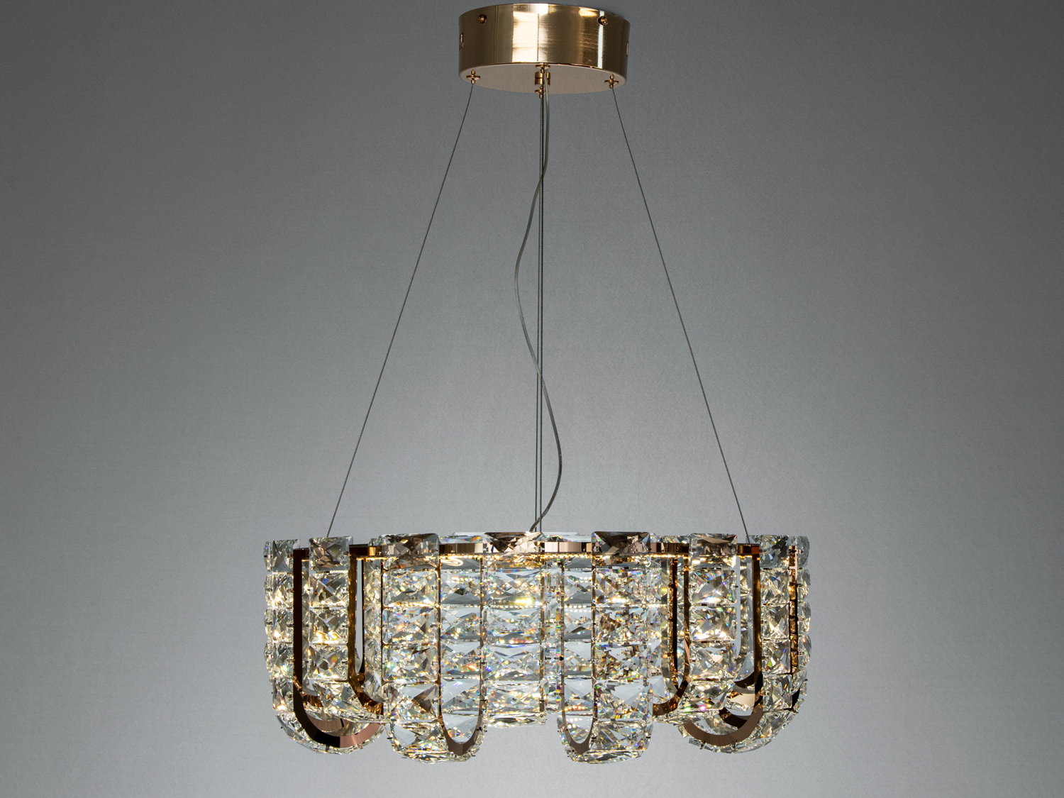 Люстра виготовлена з металевого каркасу золотого відтінку, що підкреслює розкішність виробу. Кришталеві елементи великого розміру, розташовані у вигляді арок, створюють ефектний блиск та розсіюють світло, утворюючи унікальні світлові візерунки. Така конструкція додає глибини і об′єму люстрі, роблячи її центром уваги у будь-якому інтер′єрі.
