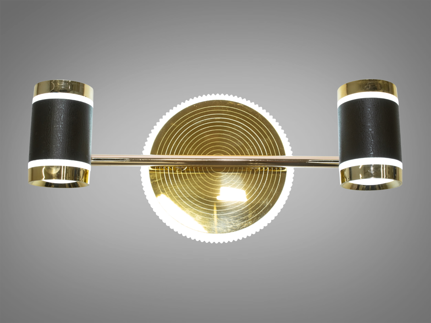 Зовнішній вигляд і дизайн. Кругла настінна основа має концентричні золотисті кільця з м’яким підсвічуванням, які формують виразний візуальний акцент. Плафон циліндричної форми з чорним фактурним покриттям втілює лаконічність, а золотистий металевий каркас додає глибини контрасту. Така комбінація кольорів золото + чорний часто поєднується зі сучасними інтер’єрами, мінімалізмом або арт-деко.