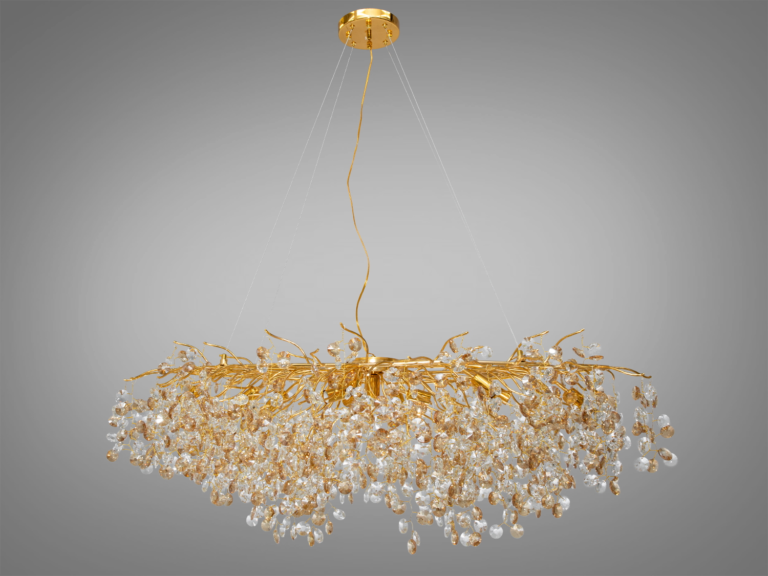 Дизайнерська люстра з алюмінієвим каркасом, облита золотом, і відблисками кришталів, створює не лише освітлення, а й емоційний зв'язок із природою та сезонами.