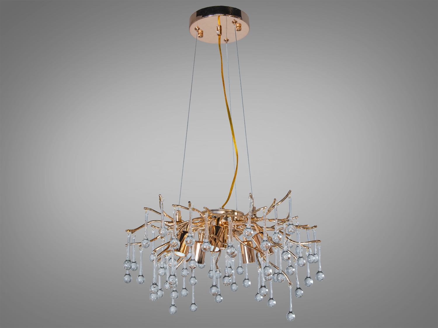 Основа люстри виконана з майстерно кручених металевих гілок, кожна з яких увінчана вертикально розташованою гірляндою з цих кришталів. Це надає люстрі витонченості та витонченості, роблячи її ідеальним вибором для створення особливої атмосфери у вашому інтер'єрі.
