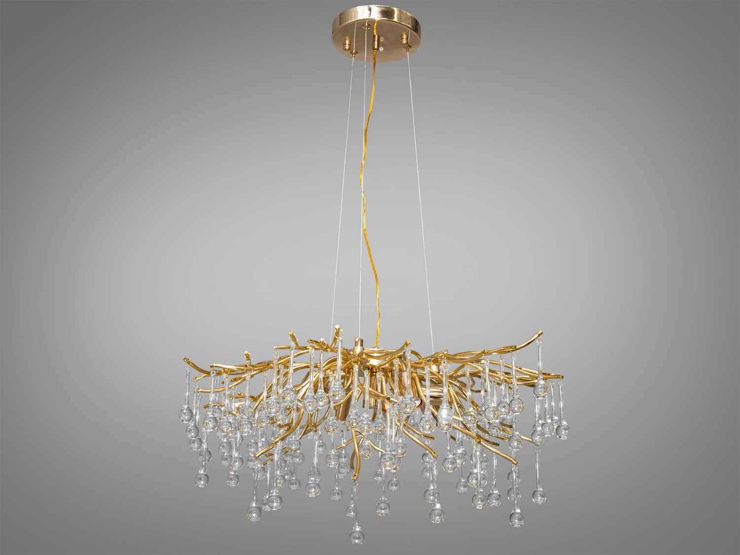 Основа люстри виконана з майстерно кручених металевих гілок, кожна з яких увінчана вертикально розташованою гірляндою з цих кришталів. Це надає люстрі витонченості та витонченості, роблячи її ідеальним вибором для створення особливої атмосфери у вашому інтер'єрі.
