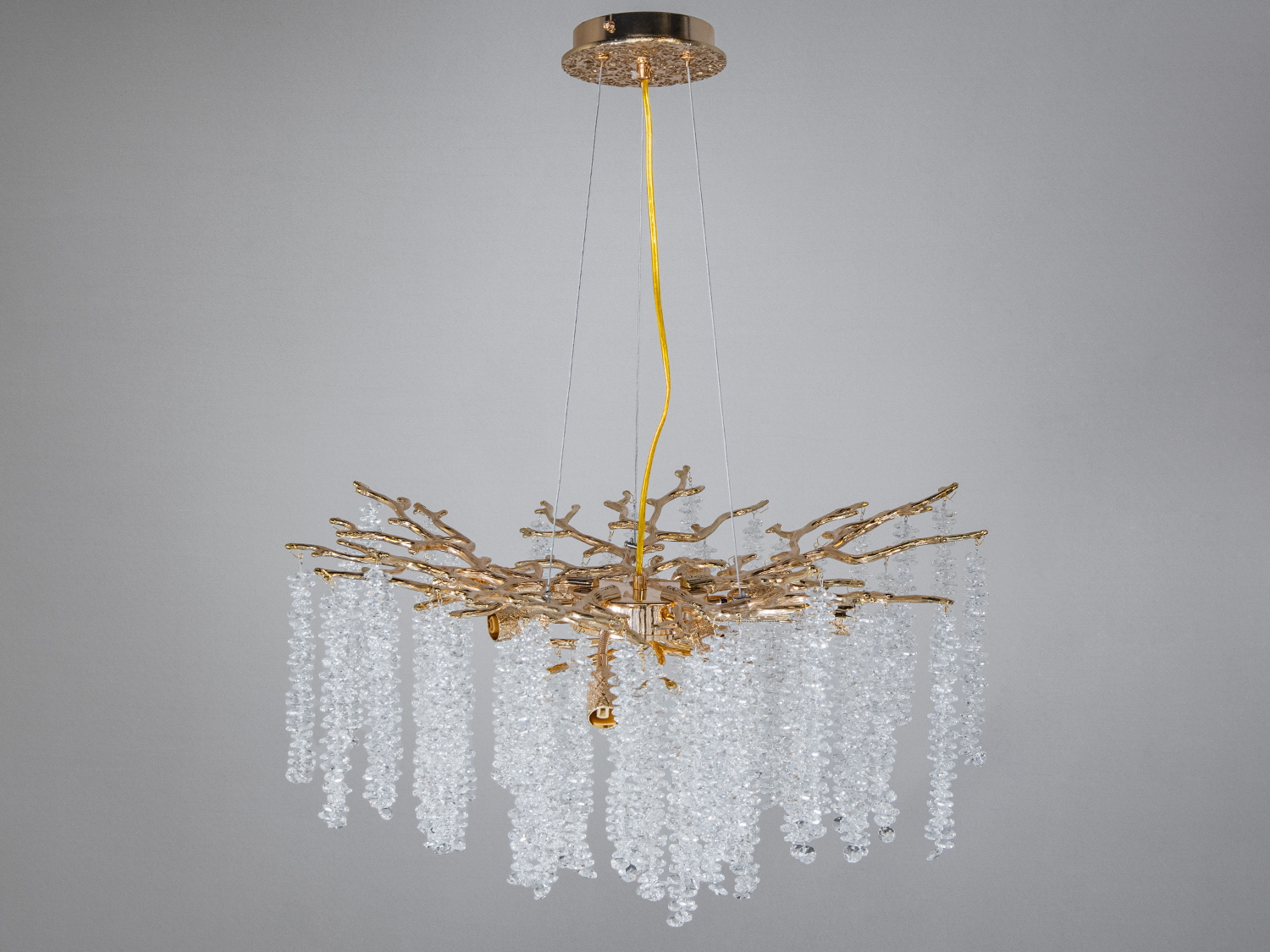Центральний каркас люстри має форму гілок, що ніби зіткані з металу і створюють відчуття природної краси. Кожна гілочка прикрашена кришталевими підвісками, що імітують витончені грона гліцинії, що сяють під будь-яким кутом огляду, створюючи ефект мерехтливого сяйва.