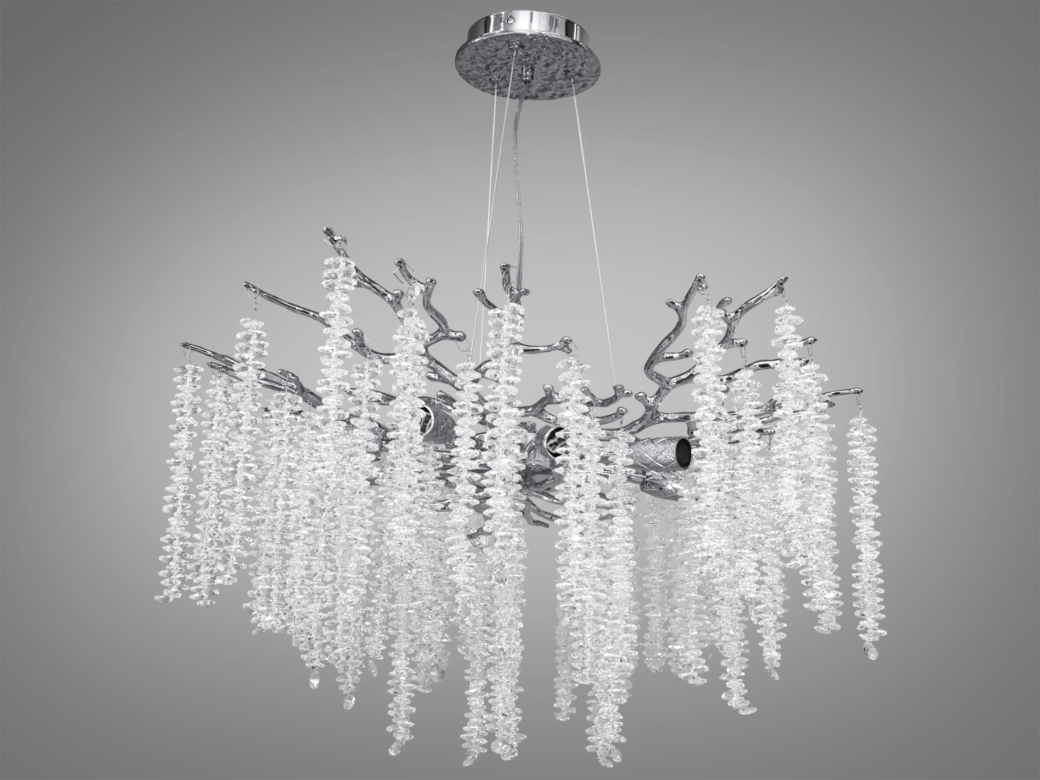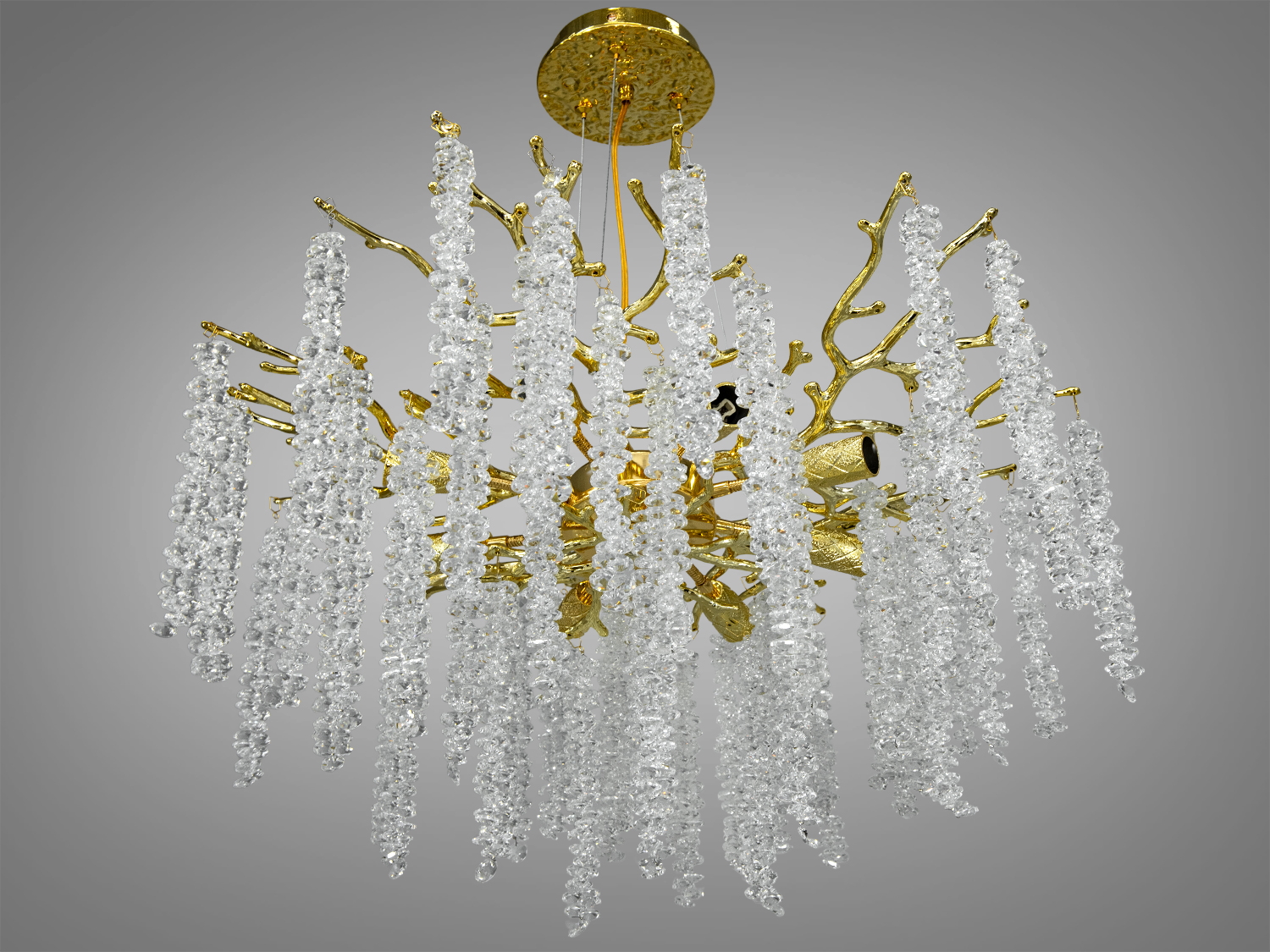 Металева основа люстри має безліч вигнутих гілочок, що додають динамічності й об’єму, роблячи центральну частину люстри справжнім витвором мистецтва. Ця люстра ідеально підходить для натяжних стель, забезпечуючи рівномірне освітлення без тіней.