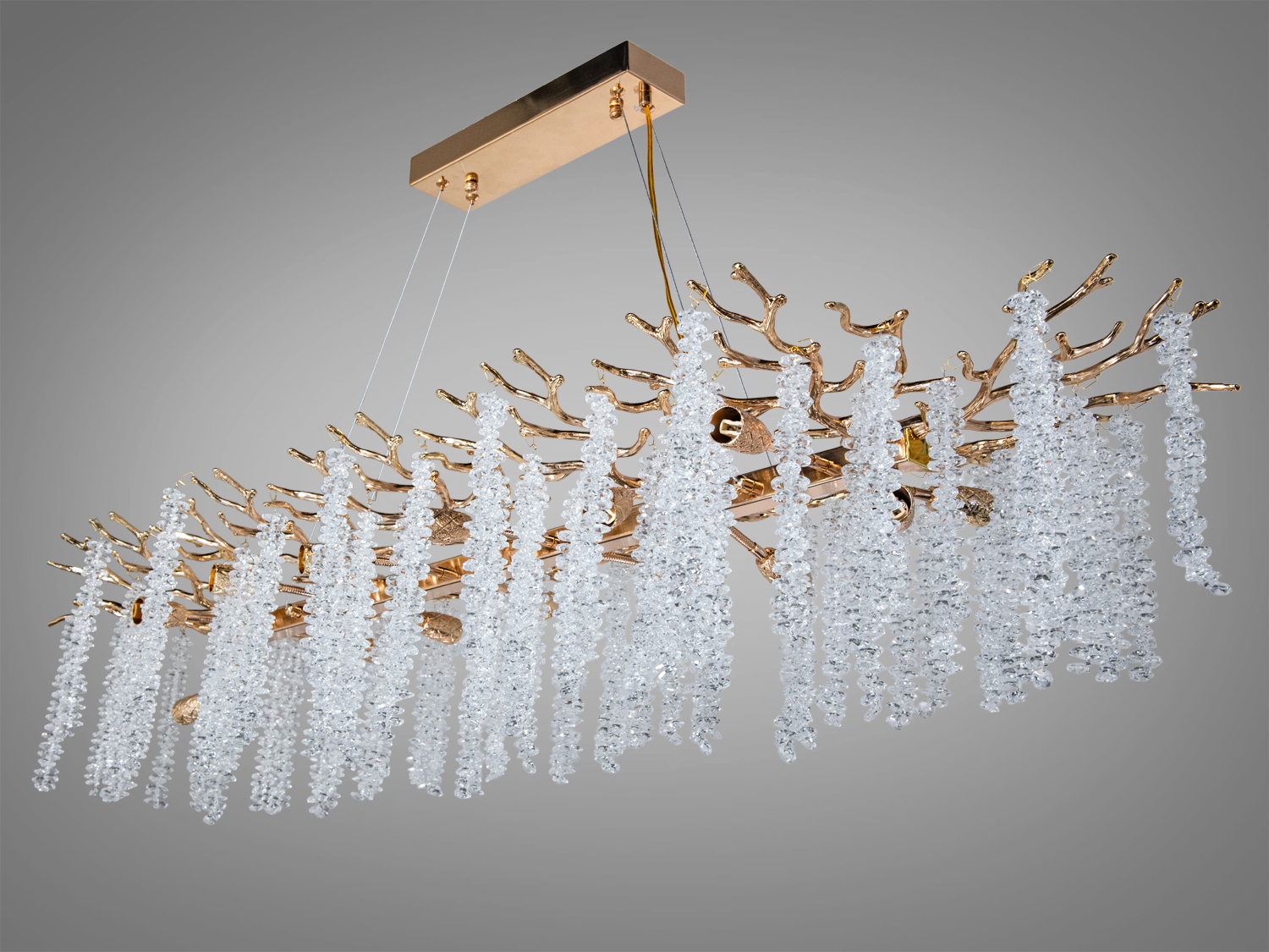 Кришталеві підвіски різних форм і розмірів створюють ефект блискучих крапель води або кришталевого дощу. Вони вільно звисають із гілок, переливаючись під світлом та створюючи чарівну атмосферу. Коли світло проходить через кришталі, воно наповнює кімнату теплим і м'яким сяйвом, яке дарує почуття затишку та комфорту.