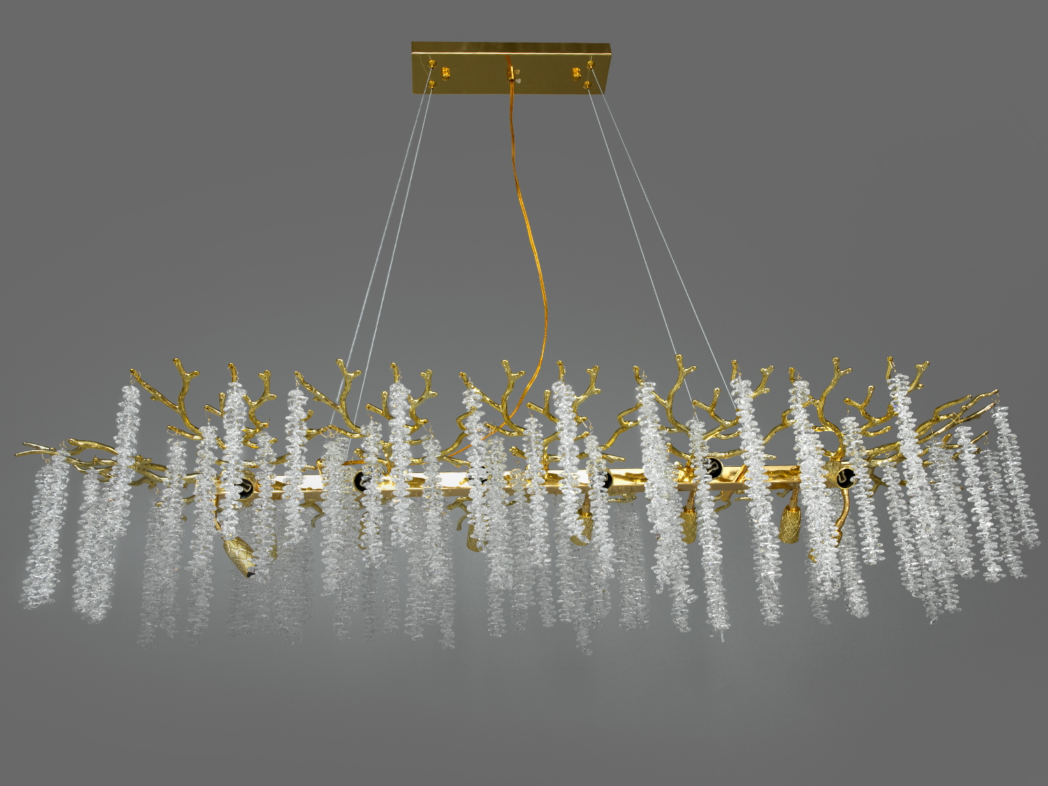 Люстра підвішена на кількох тонких тросах, що дозволяє їй виглядати такою, що левітує в повітрі.