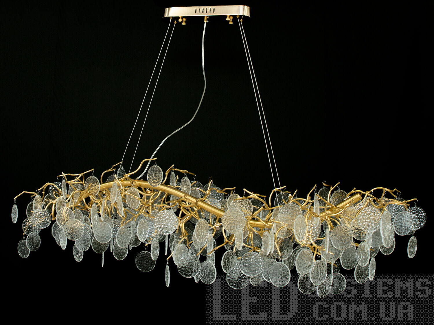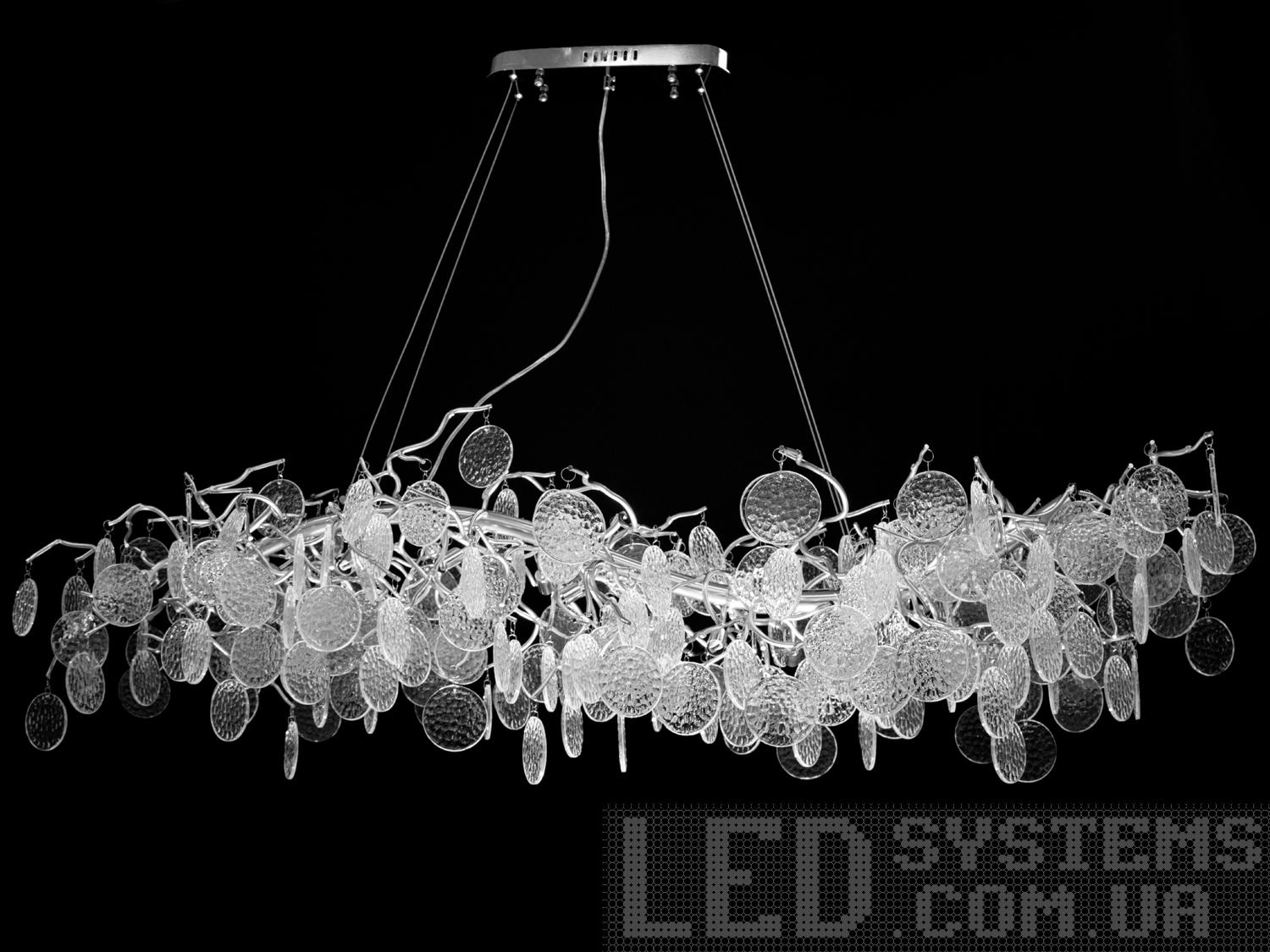 Сучасна люстра-підвіс зі скляними колами в сучасному класичному стилі на 12 ламп підходить також для довгастих кімнат. Пропорції овальних люстр ідеально гармонують із великими обідніми столами. Люстра спеціально розрахована так, що максимум яскравого світла потрапить на стіл, а решта місця приміщення наповниться м'яким світлом розсіяним скляними колами-підвісками. Стельове кріплення на планку універсальне та підходить для навісних, натяжних та звичайних стель. Застосовується як для приміщень з високими стелями, так і з невисокими, оскільки регулюється висота. Люстра-підвіс під світлодіодні або галогенові лампочки з цоколем g9.