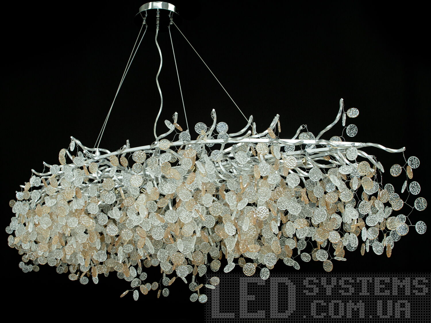 Люстра виготовлена із міцного алюмінію, що гарантує її довговічність, а гілки легко змінюють форму, дозволяючи створити об'ємну або плоску конструкцію. Центральна частина люстри складається з безлічі гілочок, що нагадують природні форми, і виготовлені з алюмінію, вкритого хромом. Ці гілочки прикрашені численними кришталевими підвісками, що створюють ефект водоспаду зі світла та блиску.