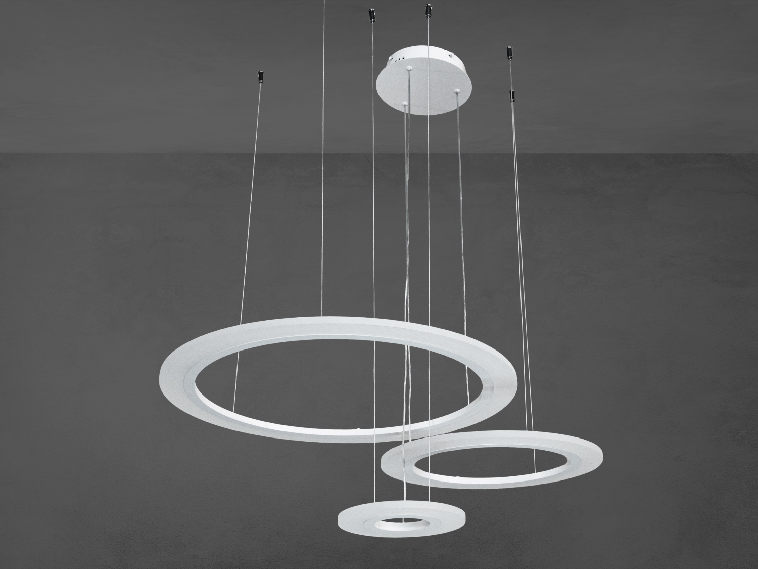 Кожне з трьох кілець люстри різного діаметру, що повисло в повітрі, створює візуально легку та аеродинамічну композицію. Розсіювачі з литого акрилу мають свої переваги: вони не тільки міцні, але й допомагають розсіювати світло рівномірно та ефективно, тим самим запобігаючи різким тіням і створюючи приємну атмосферу в кімнаті.