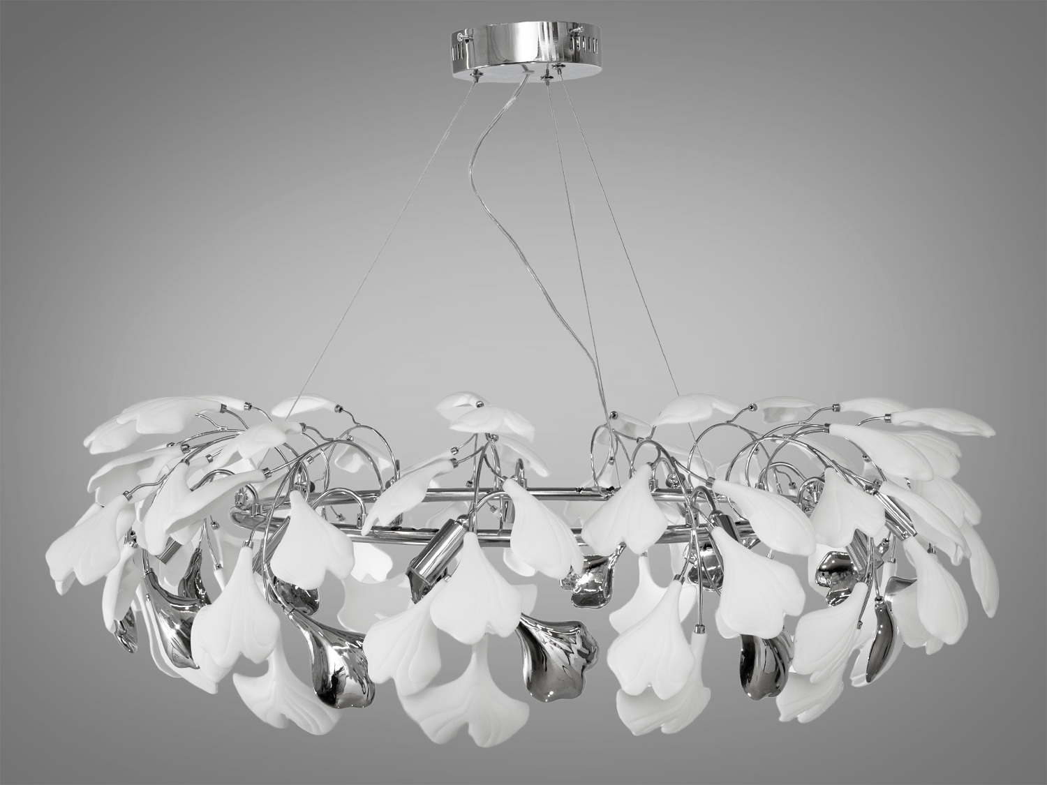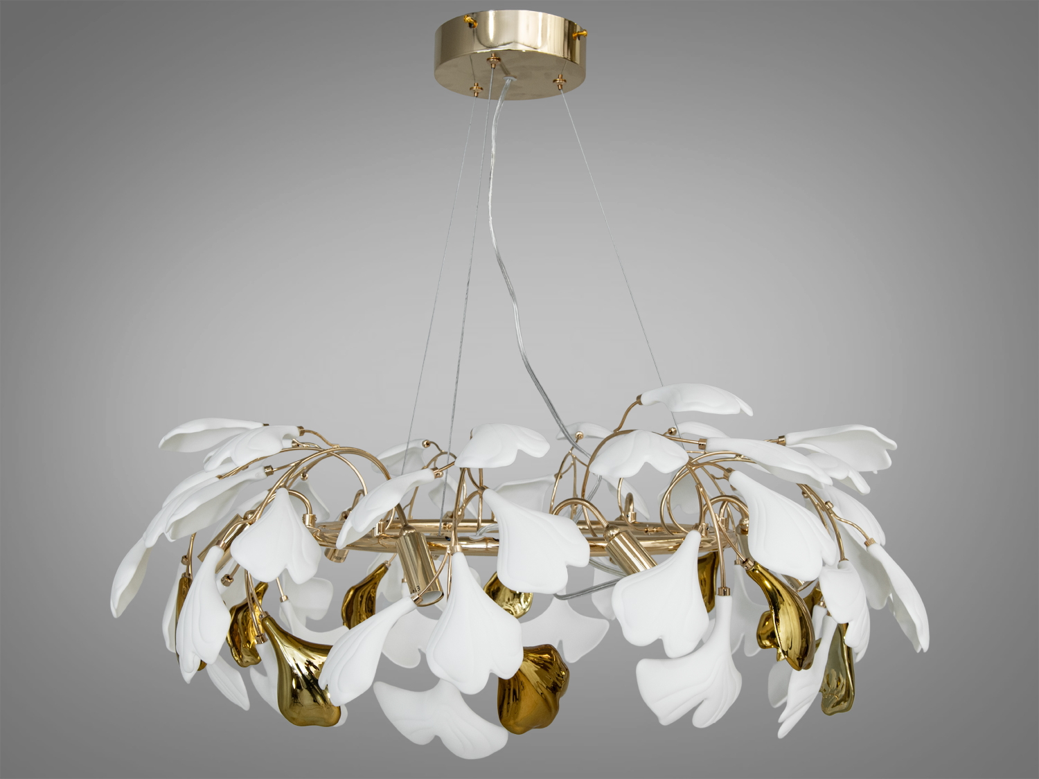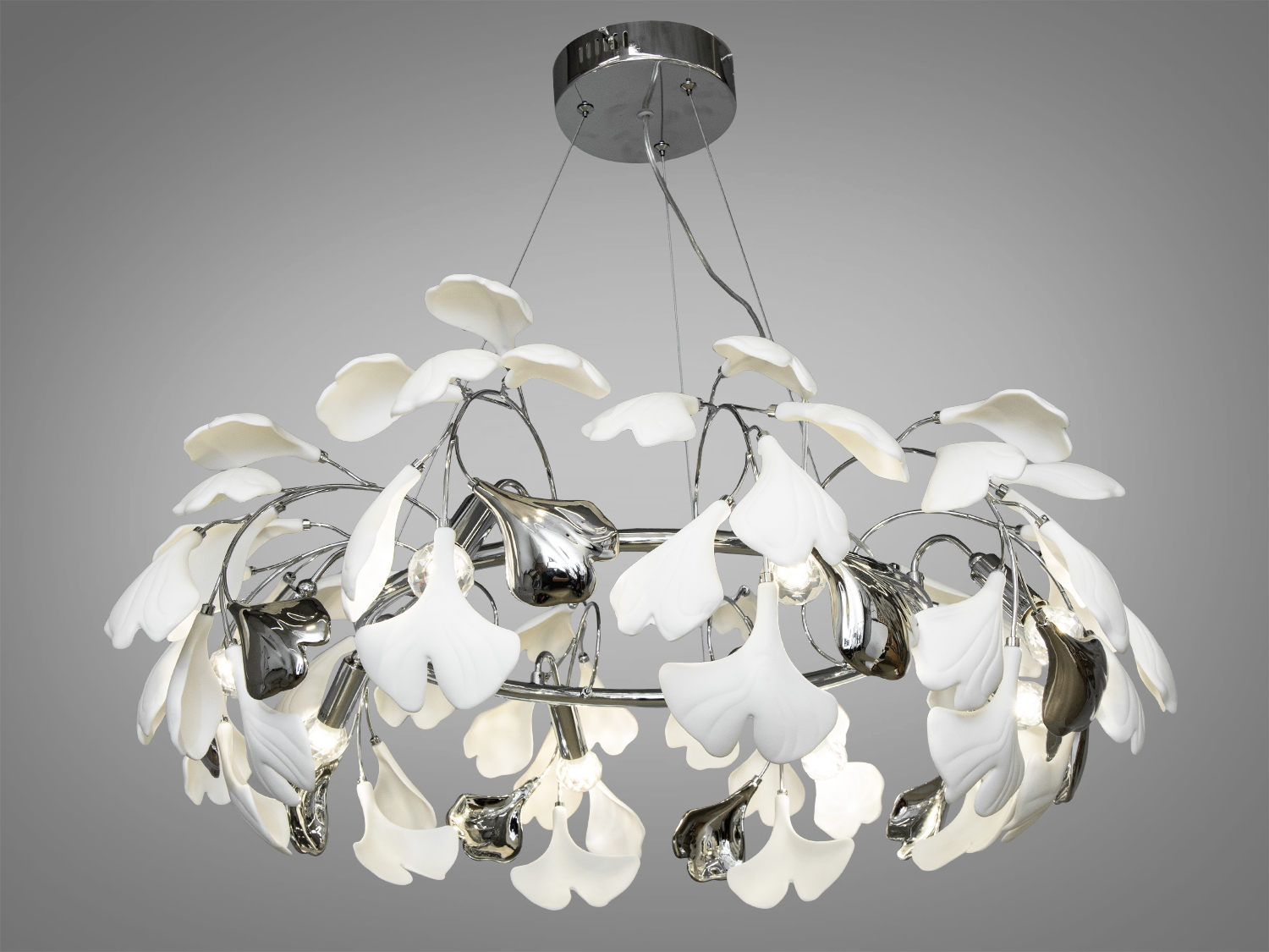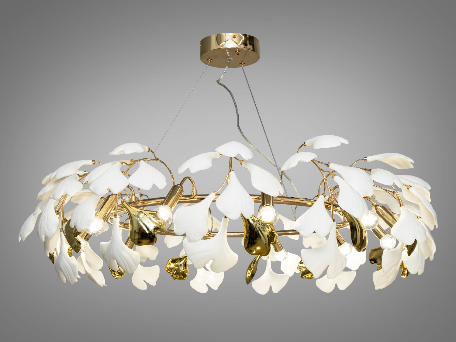 Ця вишукана люстра є шедевром дизайну, який набуває гармонії між природною красою і сучасною естетикою з ніжними керамічними пелюстками, що мають форму листя гінкго білоба - дерева. Їхній природний мотив уособлює спокій та розслаблення, приносячи в інтер'єр елементи природної гармонії, створюючи в інтер'єрі неповторну атмосферу.