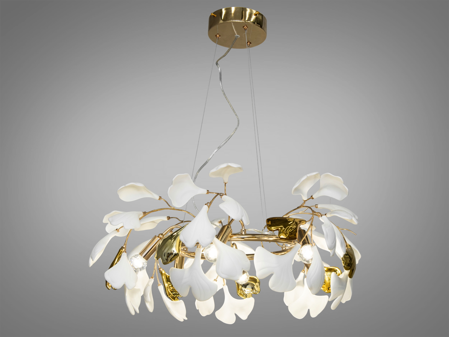Ця вишукана люстра є шедевром дизайну, який набуває гармонії між природною красою і сучасною естетикою з ніжними керамічними пелюстками, що мають форму листя гінкго білоба - дерева. Їхній природний мотив уособлює спокій та розслаблення, приносячи в інтер'єр елементи природної гармонії, створюючи в інтер'єрі неповторну атмосферу.