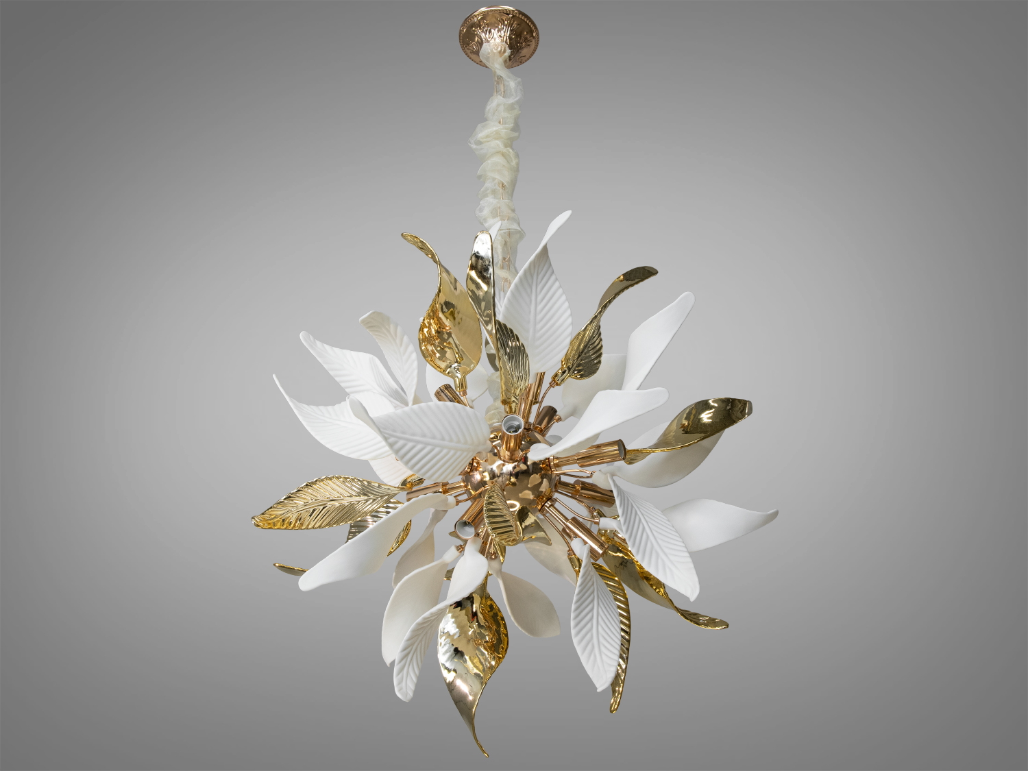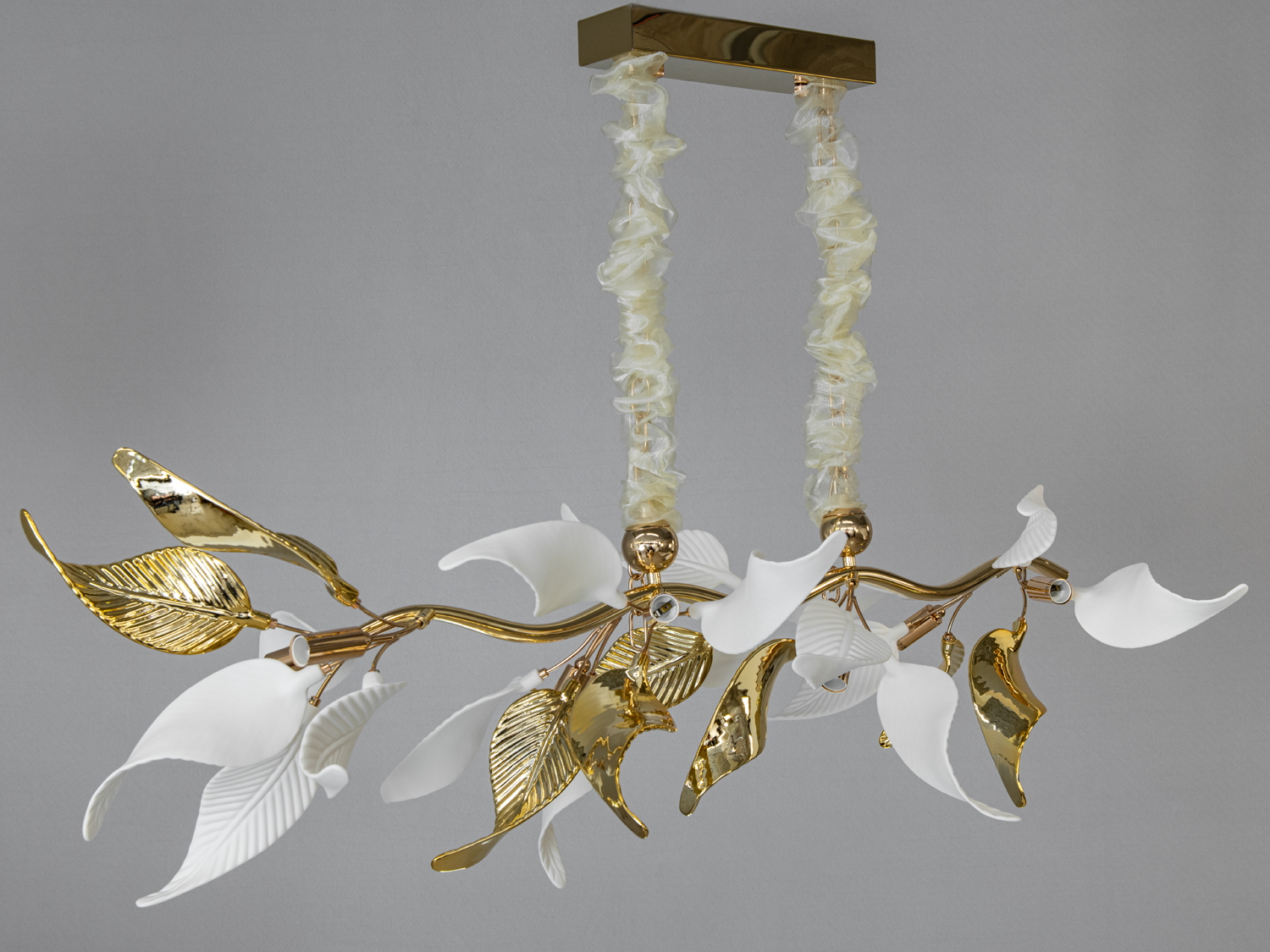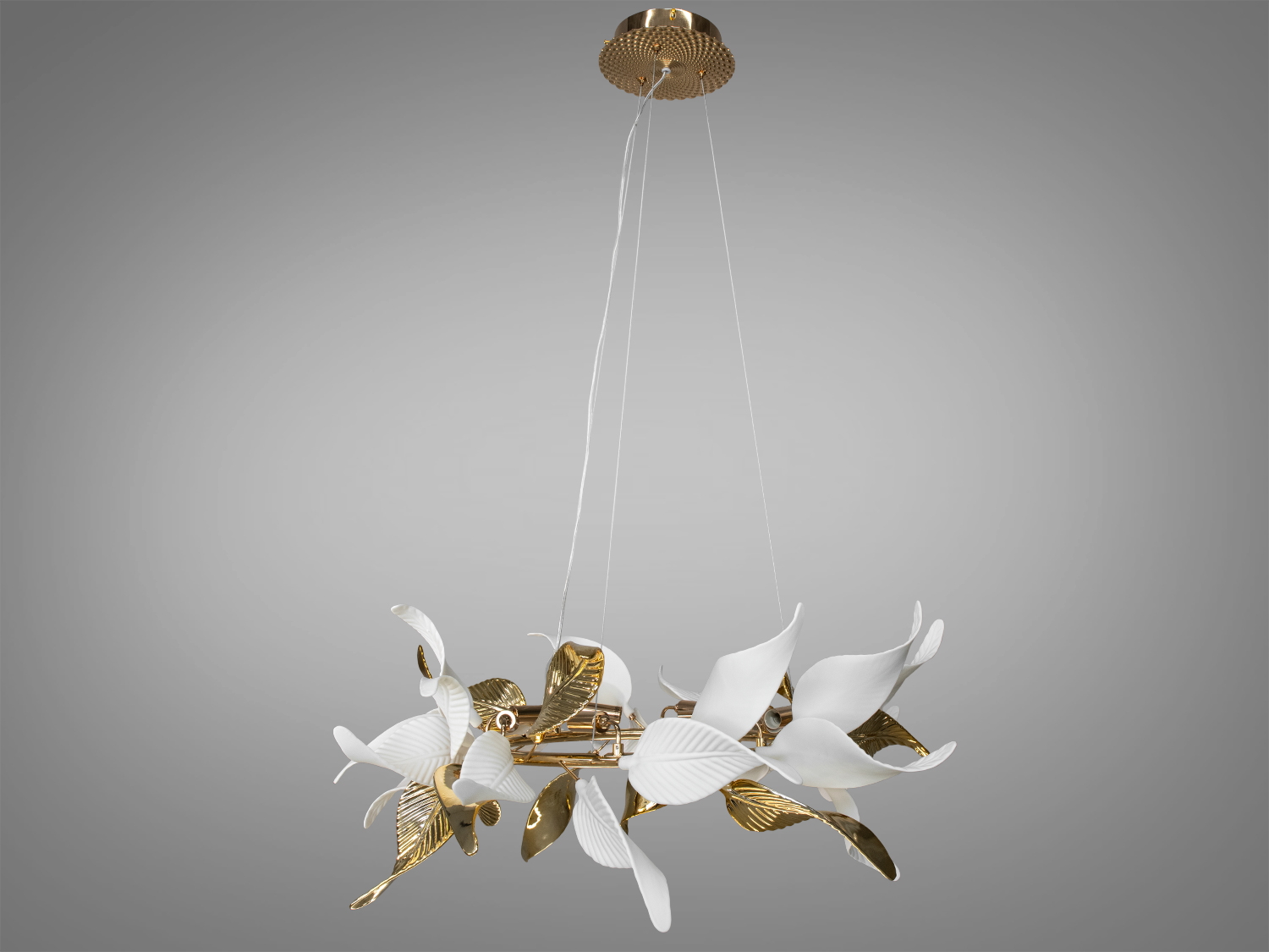 Вишукана керамічна люстра у вітальню на 12 ламп з цоколем E14 призначена для того, щоб стати головною прикрасою вашого інтер'єру. Її дизайн натхненний природними мотивами: білі пелюстки, обрамлені золотим листям, створюють образ витонченої квітки, що ширяє в повітрі. Підвісна конструкція з кріпленням на монтажну планку та ланцюг, обтягнутий вишуканим чохлом, підкреслюють увагу до деталей.
