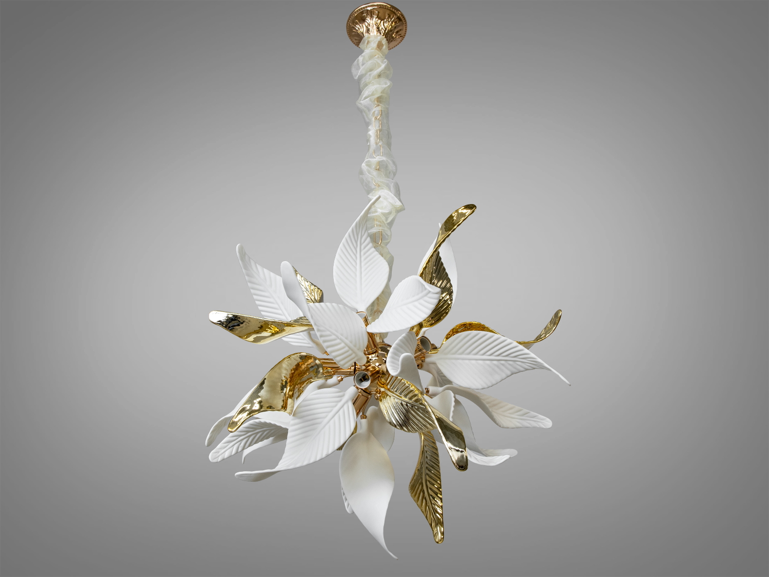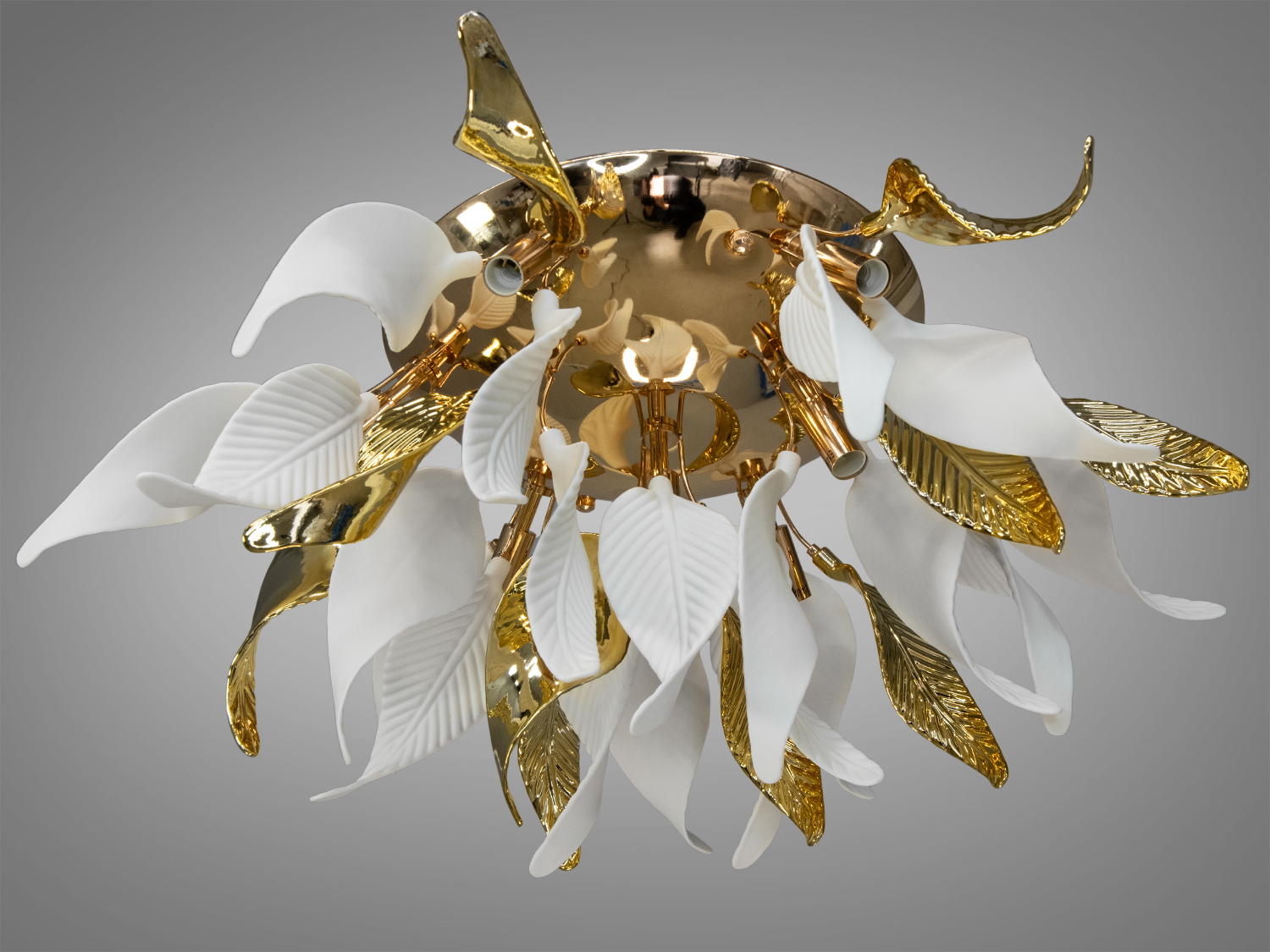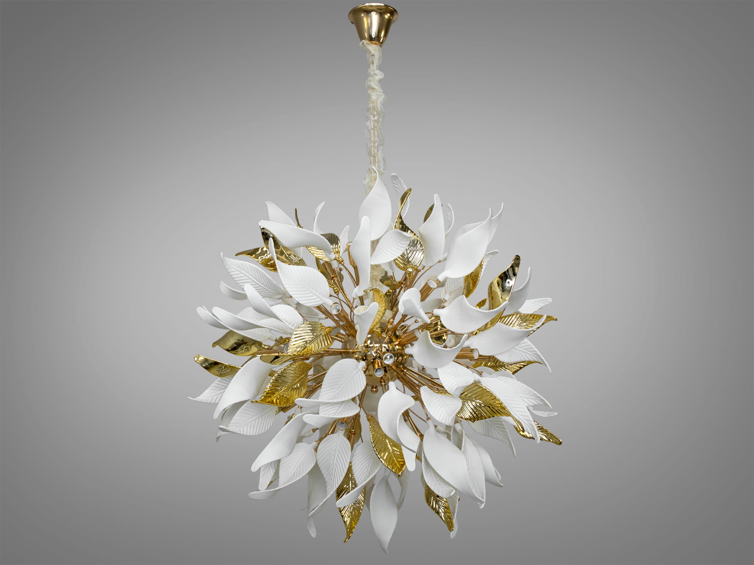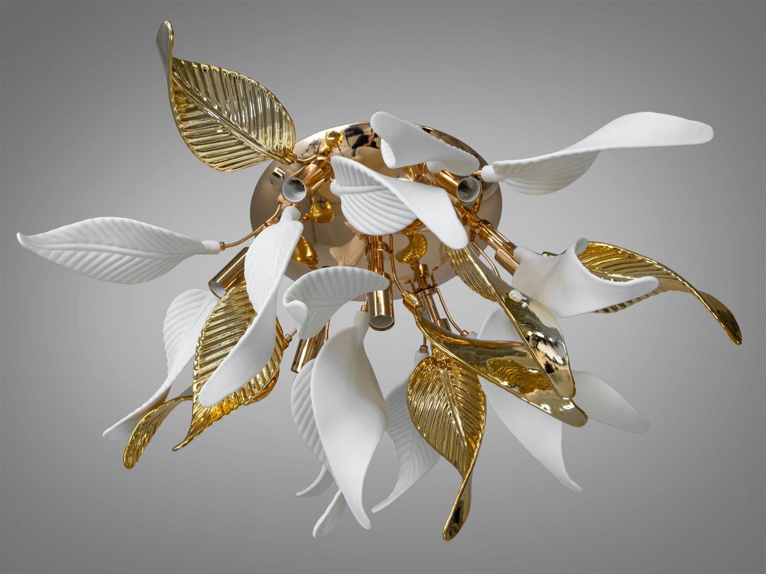 Вишукана керамічна люстра у вітальню на 12 ламп з цоколем E14 призначена для того, щоб стати головною прикрасою вашого інтер'єру. Її дизайн натхненний природними мотивами: білі пелюстки, обрамлені золотим листям, створюють образ витонченої квітки, що ширяє в повітрі. Підвісна конструкція з кріпленням на монтажну планку та ланцюг, обтягнутий вишуканим чохлом, підкреслюють увагу до деталей.