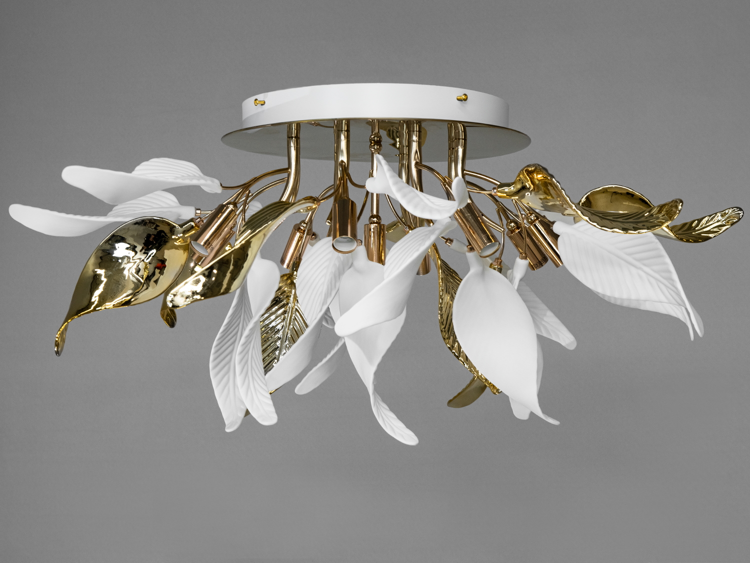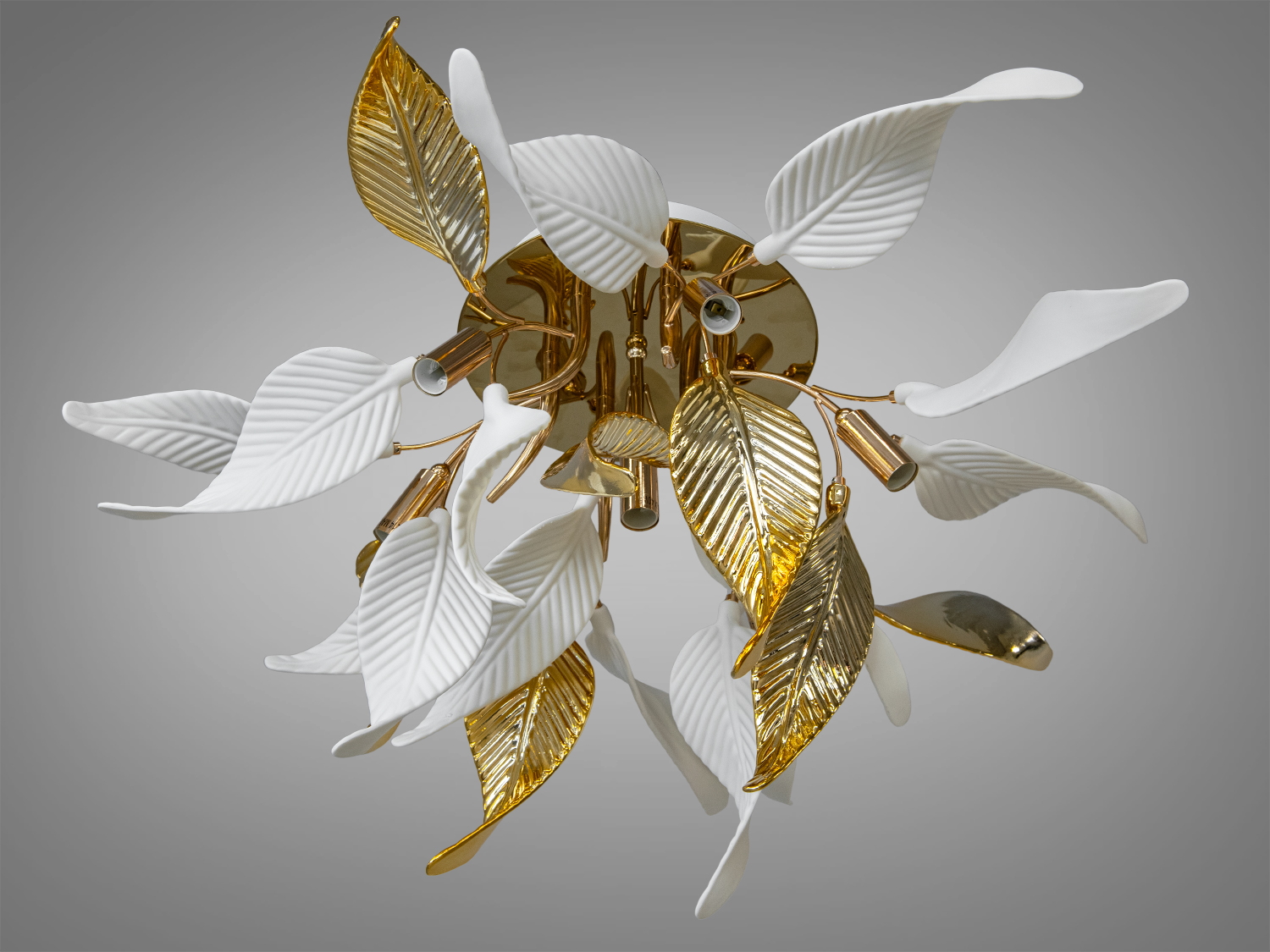 Оригінальна люстра з керамічними елементами розрахована на 6 ламп із цоколем E14, поєднуючи витонченість форм з якісними матеріалами. Основа люстри виготовлена з міцного металу з елегантним золотистим покриттям, яке надає виробу благородного та розкішного вигляду. Пелюстки виконані з білої кераміки з виразними золотими акцентами, що створюють враження природної легкості та витонченості.