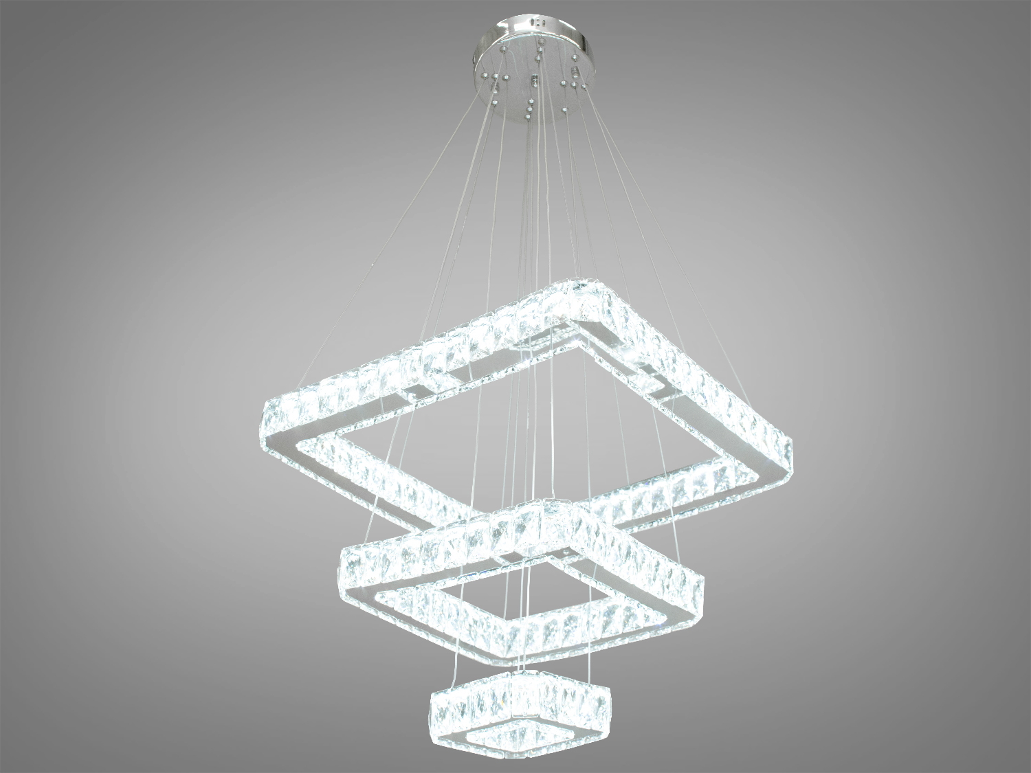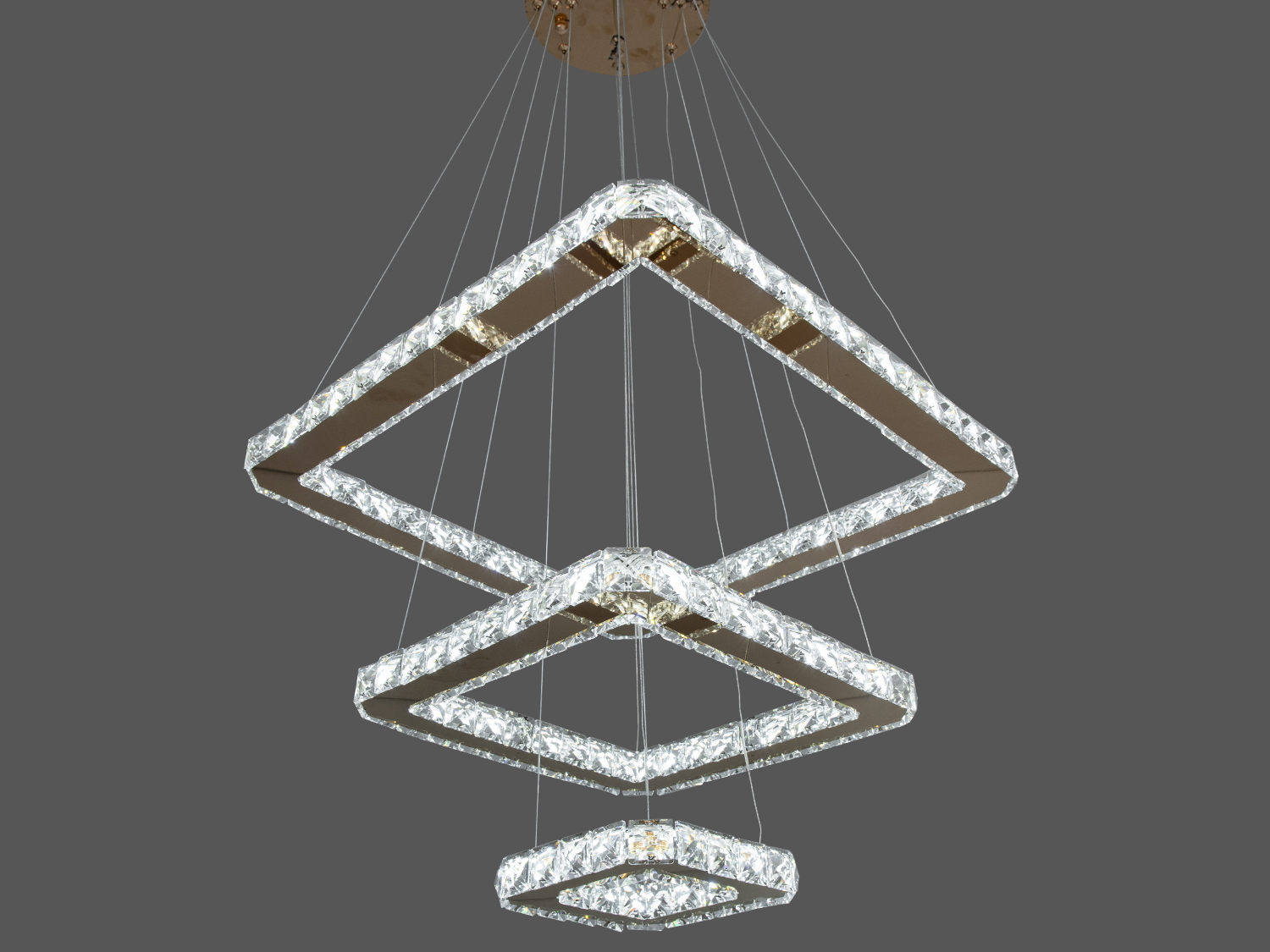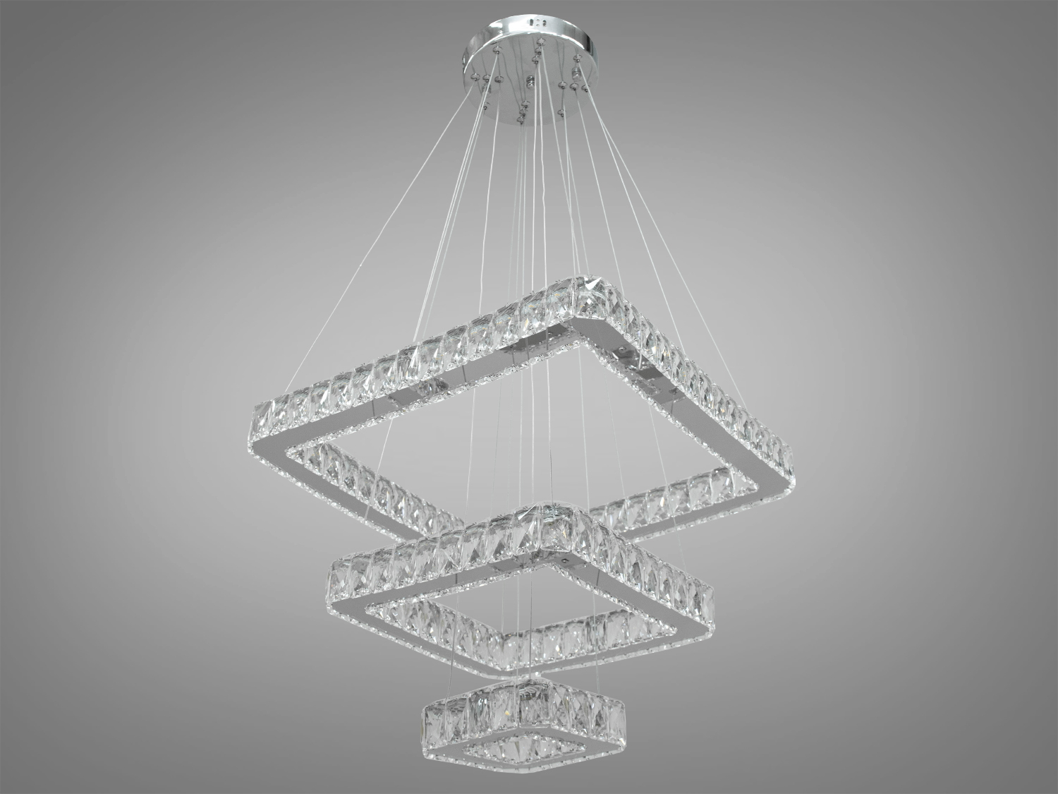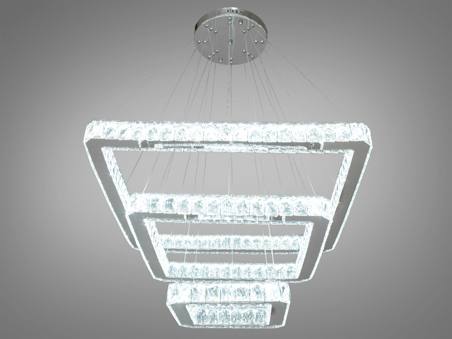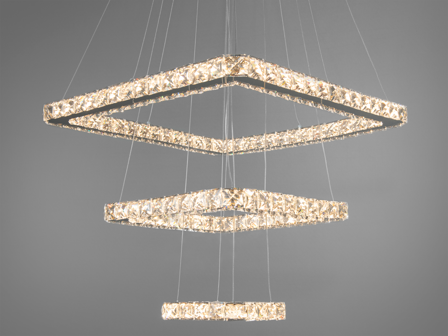 Люстра складається з трьох рівнів квадратних кілець, прикрашених кришталевими вставками, які мерехтять у світлі. Тонкі троси створюють ілюзію, ніби люстра витає у повітрі, додаючи приміщенню легкості та невагомості. Світло, що пронизує кристали, розсипається тисячами іскорок, наповнюючи простір магічною атмосферою.