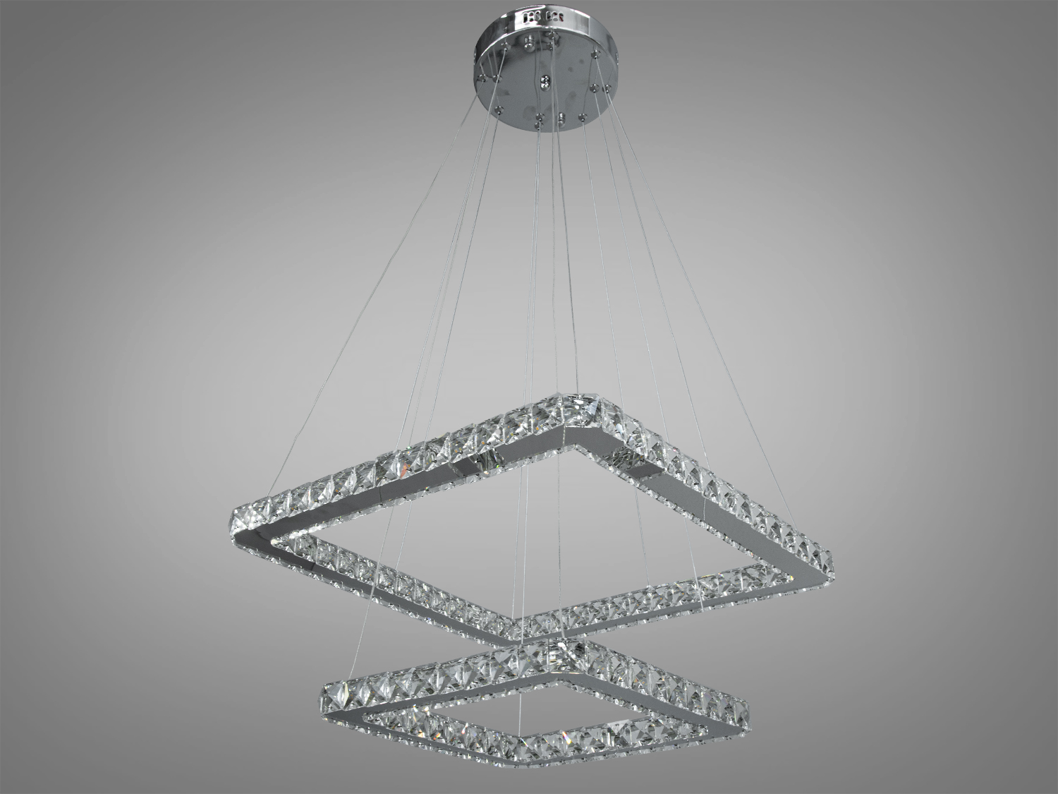 Люстра складається з двох квадратів різних розмірів, підвішених паралельно. Кришталеві вставки на кожному елементі відбивають світло, створюючи м′яке та затишне освітлення. Золоті деталі додають нотки елегантності та розкоші.