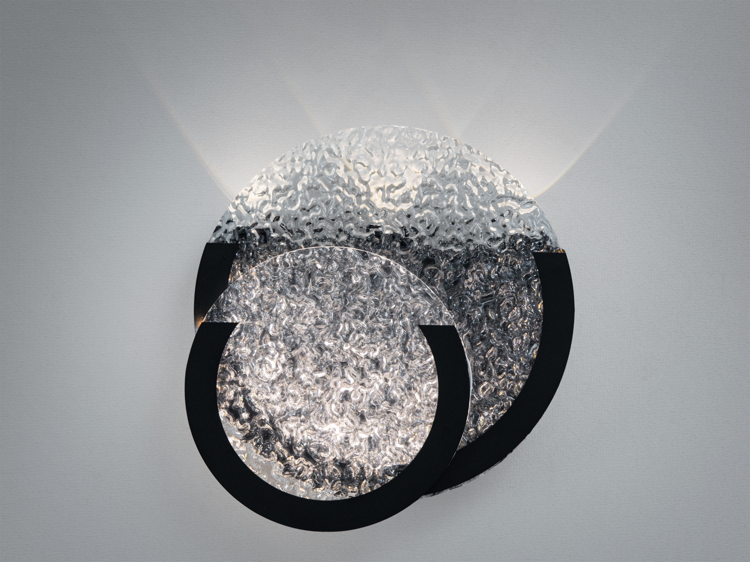 - Ромбовидний рельєфний скляний плафон формує унікальний силует і м’яко розсіює світло, створюючи виразний світловий малюнок на стіні.