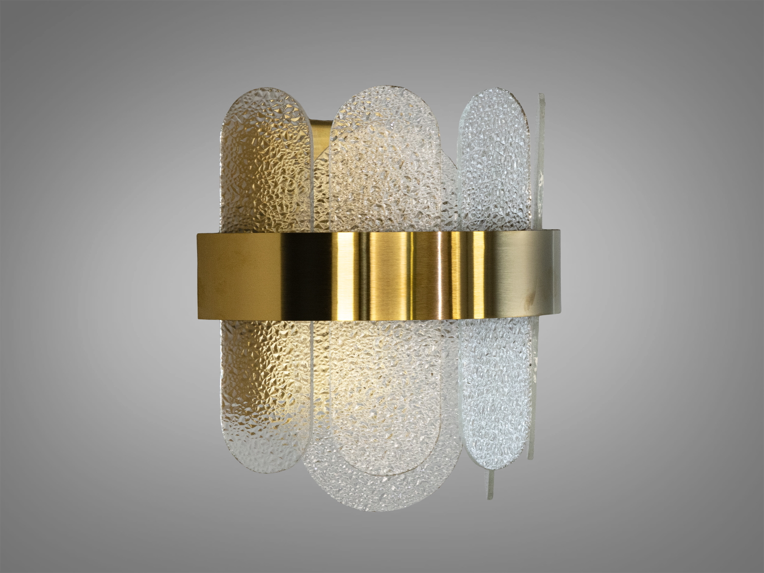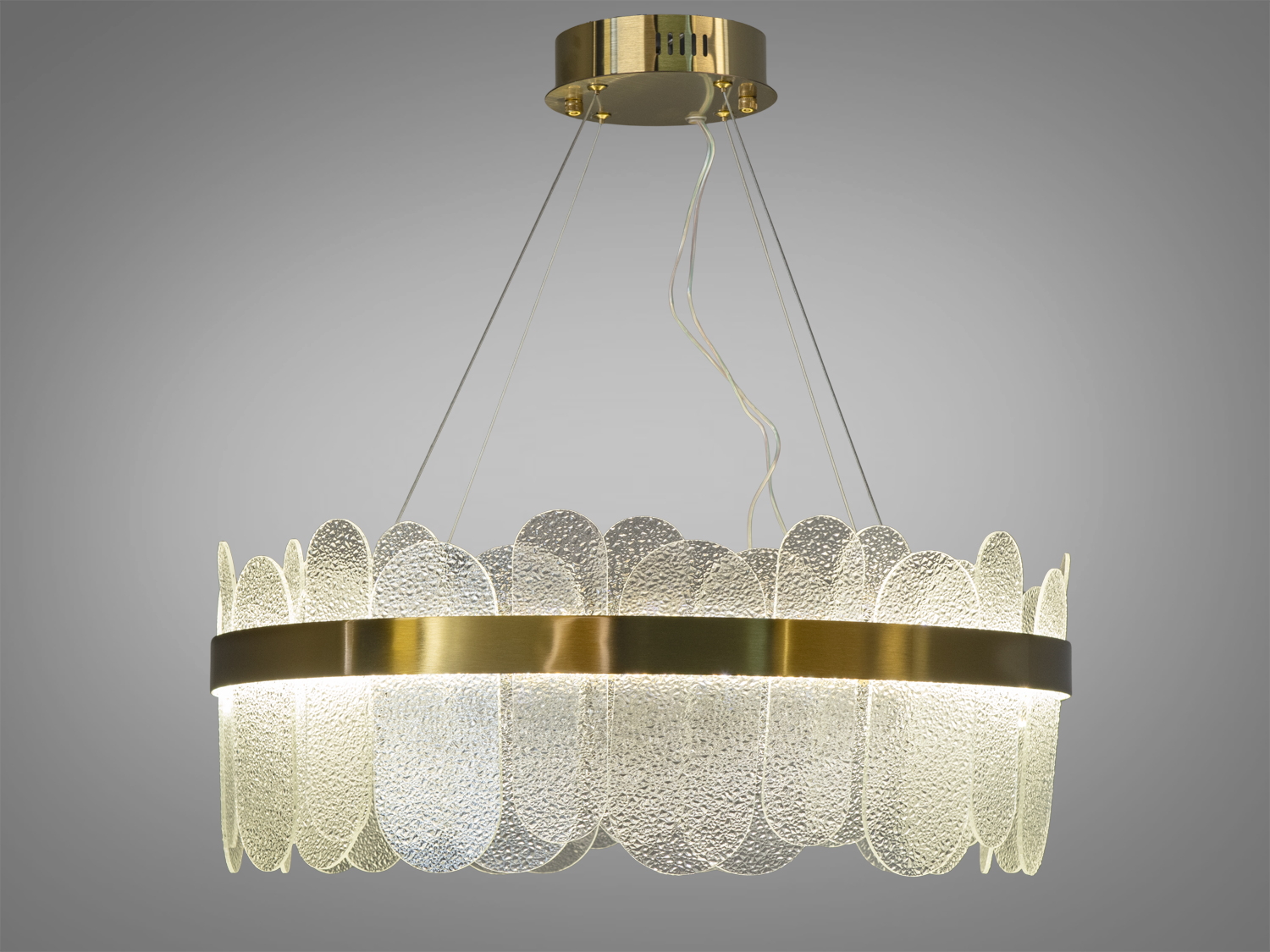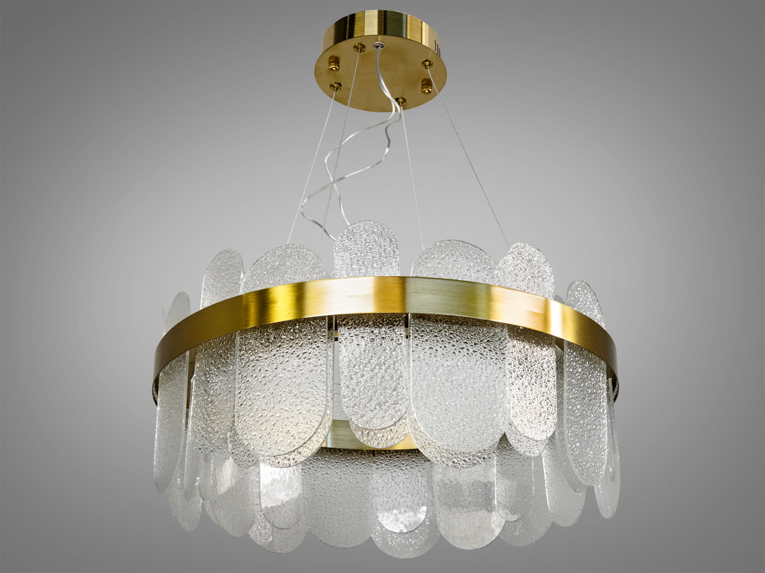 Люстра має круглу форму з елегантним золотистим обідком, який надає їй вишуканості. Прозорі кришталеві елементи створюють захоплюючий блиск, що відображає світло у всіх напрямках, наповнюючи простір іскристим сяйвом.