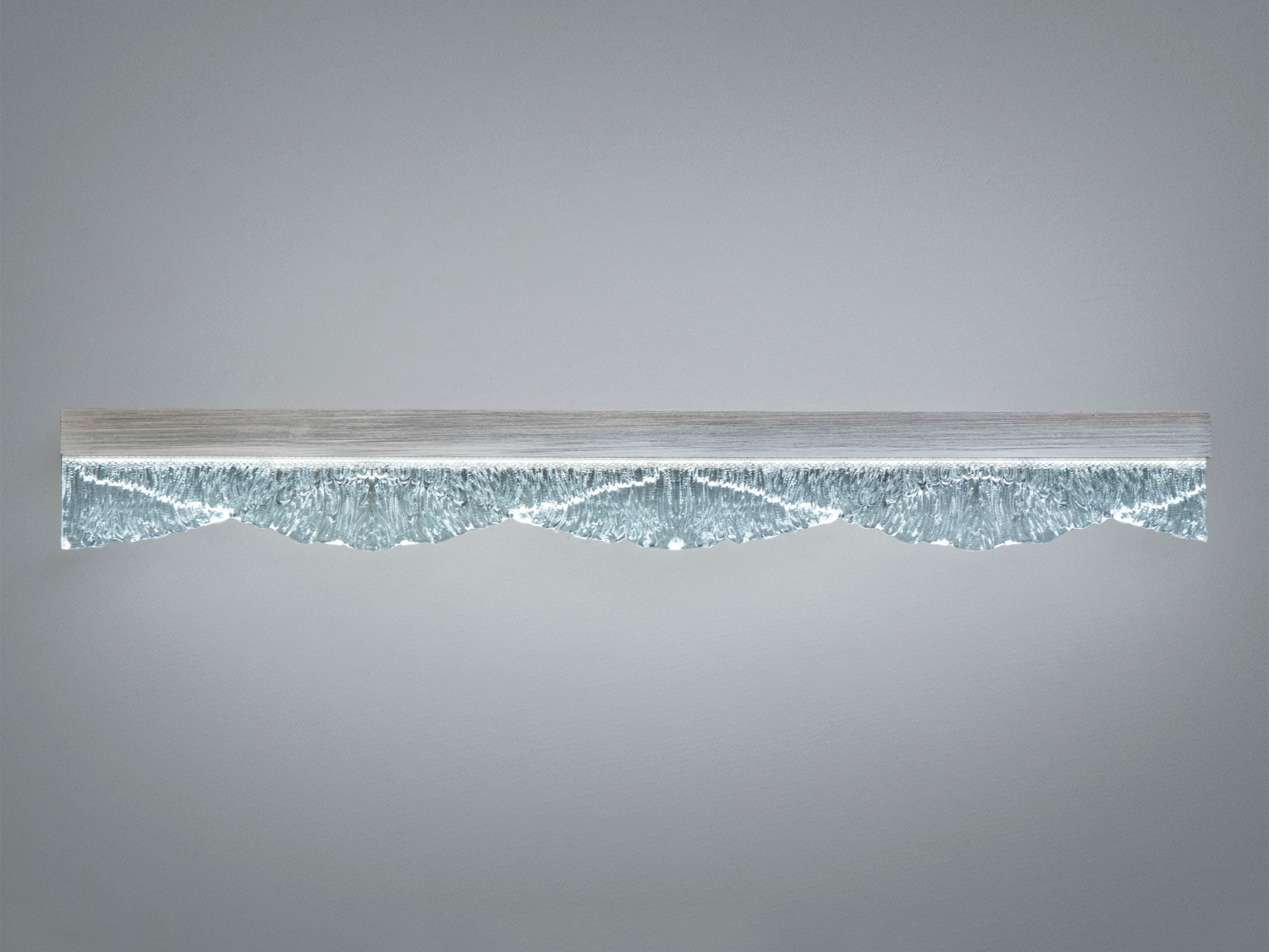 Світильник має лінійну форму з чіткими геометричними контурами чорного корпусу, який контрастує з прозорим скляним елементом хвилястої форми. Скло має рельєфну структуру, що нагадує хвилі, і забезпечує розсіювання світла, створюючи м′яке і приємне освітлення.